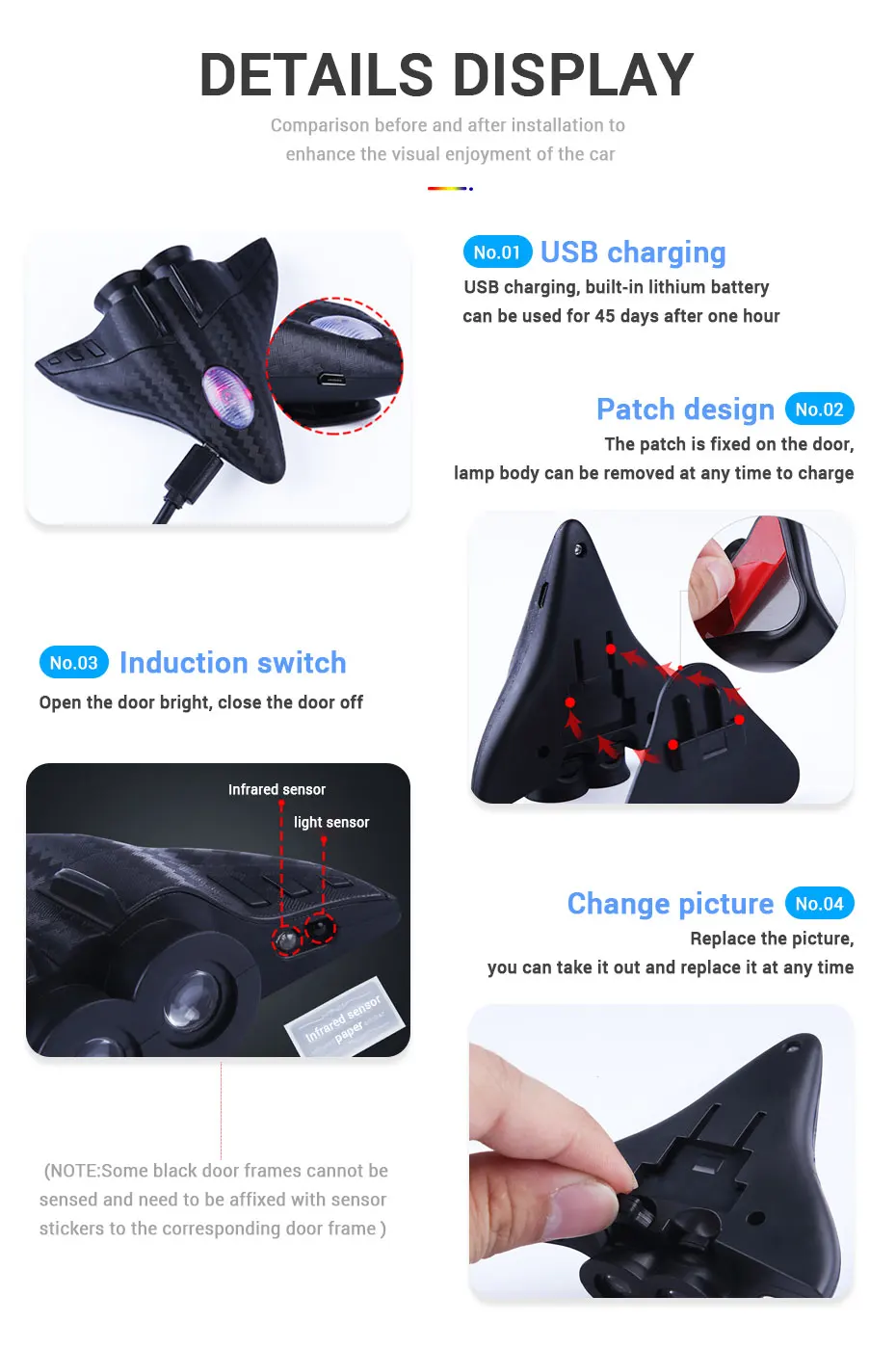 1. Динамический предупреждающий светильник в форме самолета, автоматически откройте дверь, чтобы включить динамическую проекцию, чтобы предотвратить столкновение пешеходов сзади
