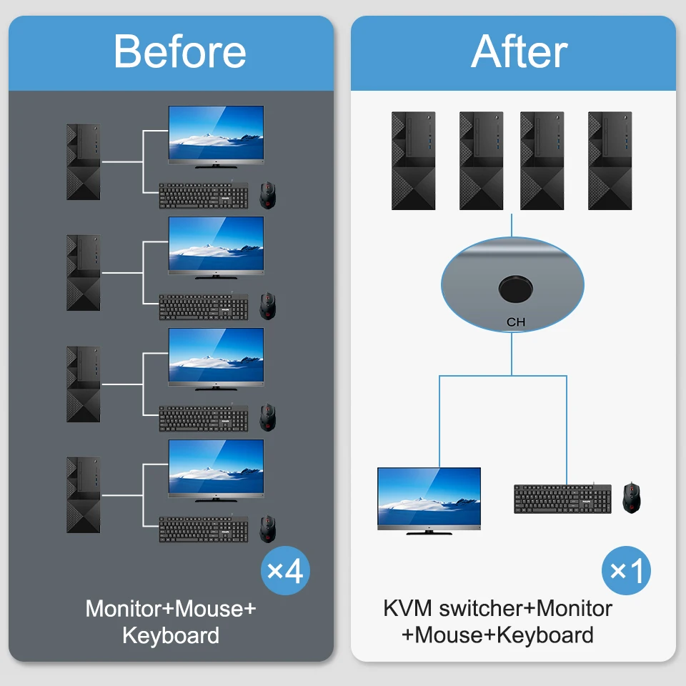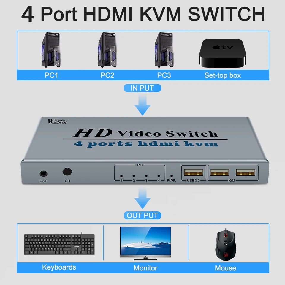 Коммутатор Wiistar HDMI KVM позволяет использовать одну usb-клавиатуру, usb-мышь и монитор для управления 4 компьютерами. Он предназначен для многозадачности с двумя компьютерами для вашего удобства, повышения производительности в офисе или дома; Вы можете переключаться между 4 компьютерами с помощью ручного переключателя, расположенного в верхней части блока KVM