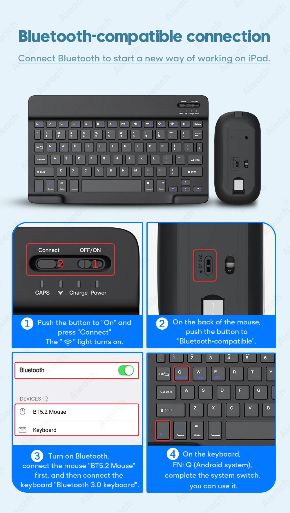 1. Система должна быть переключена перед использованием. 2. Если вы приобретали клавиатуру + мышь, пожалуйста, сначала Подключите мышь, а затем подключите клавиатуру. 3. Пожалуйста, сначала проверьте точную модель планшета и приобретайте в соответствии с моделью. 4. Перед использованием, пожалуйста, проверьте, подходят ли стиль клавиатуры и настройки языка в "настройках" для вашего использования. 5. Если у Вас возникли какие-либо проблемы, пожалуйста, свяжитесь с нашей службой поддержки клиентов, чтобы помочь вам.