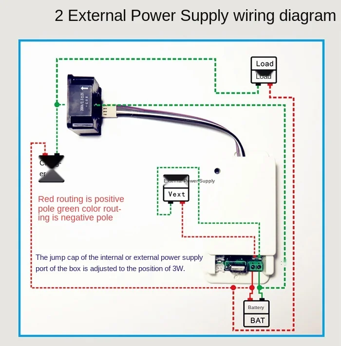 Объяснение: еслиБатарея под испытанием (источник питания) Диапазон напряжения не в нормальной работе (6-80 в) междуВнешний режим подключения источника питания может быть принят, сначала выберите интерфейс источника питанияПеремычка с регулировкой на «3 Вт», Подключите положительные и отрицательные полюсы внешнего источника питания к «+ Vext-», будьте осторожны, «+» подключите положительный полюс внешнего источника питания, «-» Подключите отрицательный полюс внешнего источника питания; Затем подключите аккумулятор, когда проводка (источник питания) положительные и отрицательные полюсы подключены к порту измерения напряжения «+ летучая мышь», будьте осторожны, подключите аккумулятор (питание) Поставка) положительный полюс, «-» Подключите аккумулятор (источник питания) отрицательный полюс. Аккумулятор (источник питания) Не подключайте положительные и отрицательные полюсы цепи неправильно или реверсивно, поставьте батарею (источник питания) положительный полюс нагрузки подключен к положительному полюсу нагрузки, аккумулятор (источник питания) отрицательный полюс подключен к отрицательному полюсу Нагрузки через датчик холла, когда направление тока, проходящего через датчик холла, соответствует направлению силы на стрелке датчика Холла, измеренный ток будет отображаться как положительное значение, напротив, измеренный ток отрицательный.