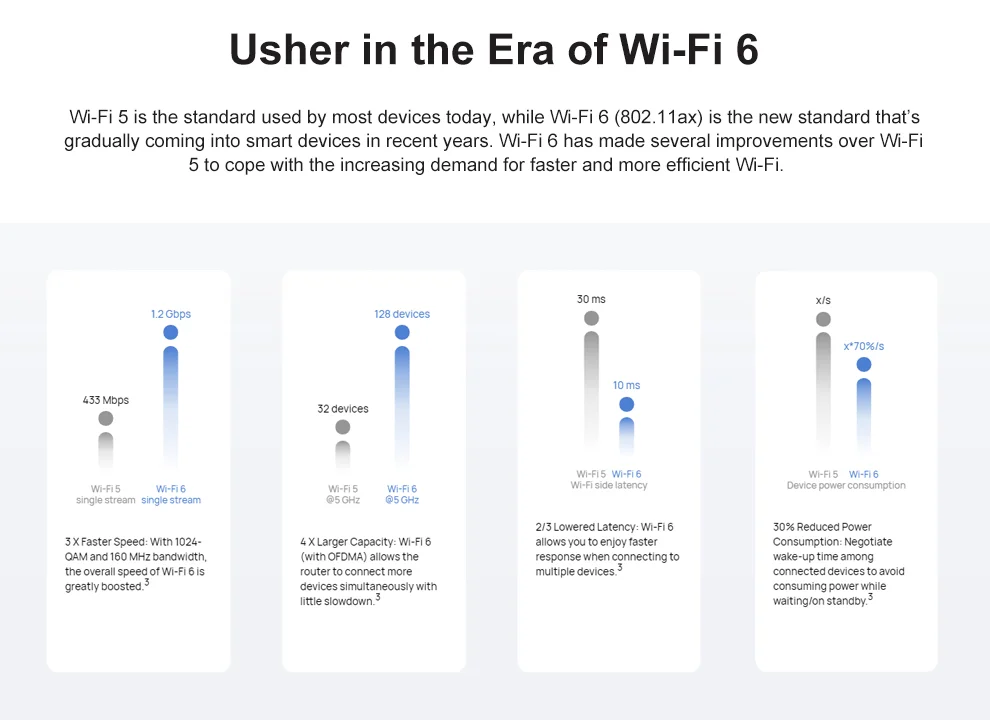 Wi-Fi 5 является стандартом, используемым большинством устройств сегодня, в то время как Wi-Fi 6(802.11ax) является новым стандартом, который постепенно переходит в смарт-устройства в последние годы. Wi-Fi 6 сделал несколько улучшений по Wi-Fi 5, чтобы справиться с растущим спросом на более быстрый и эффективный Wi-Fi.