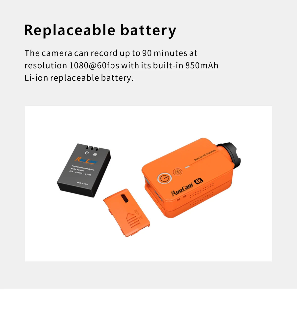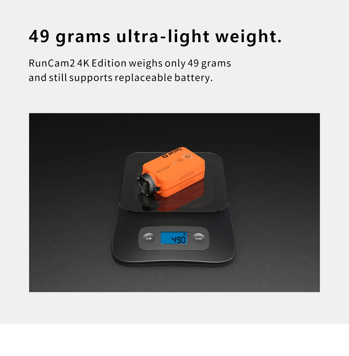 RunCam2 4K Edition весит всего 49 граммов и по-прежнему поддерживает сменную батарею.