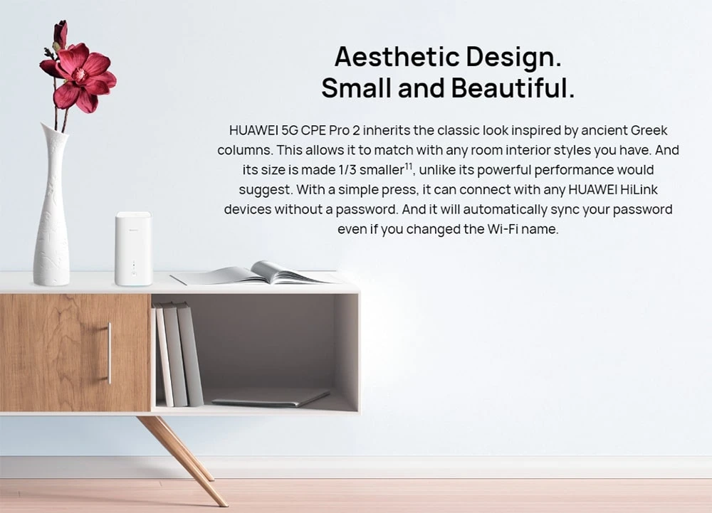 HUAWEI 5G CPE Pro 2 наследует классический образ, вдохновленный древними греческими колоннами. Это позволяет сочетать его с любым стилем интерьера комнаты, который у вас есть. И его размер сделан 1/3 smaller11, в отличие от его мощных характеристик, которые могли бы предложить. Простое нажатие позволяет подключаться к любым устройствам HUAWEI HiLink без пароля. И он автоматически синхронизирует ваш пароль, даже если вы изменили имя Wi-Fi.