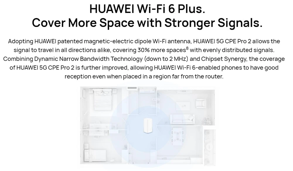 Используя запатентованную магнитно-электрическую дипольную Wi-Fi антенну HUAWEI 5G CPE Pro 2, позволяет сигналу путешествовать во всех направлениях, покрывая на 30% больше разделов 8 равномерно распределенными сигналами. Сочетая динамическую узкую полосу пропускания (до 2 МГц) и чипсет Synergy, охват HUAWEI 5G CPE Pro 2 еще больше улучшен, позволяет телефонам с поддержкой HUAWEI Wi-Fi 6 иметь хороший прием даже при размещении в регионе, далеком от маршрутизатора.