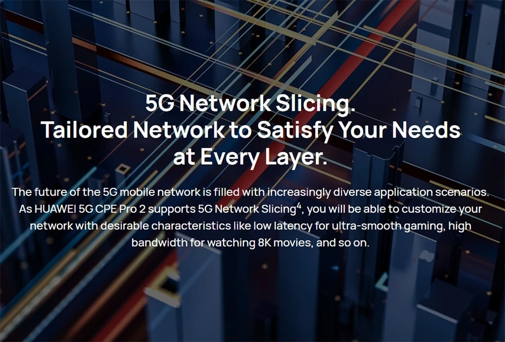 Будущее мобильной сети 5G наполнено все более разнообразными сценариями применения. Поскольку HUAWEI 5G CPE Pro 2 поддерживает 5G Network Slicing4, вы сможете настроить свою сеть с желаемыми характеристиками, такими как низкая задержка для сверхплавных игр, высокая пропускная способность для просмотра фильмов 8K, И так далее.