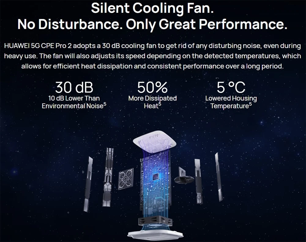 HUAWEI 5G CPE Pro 2 оснащен охлаждающим вентилятором на 30 дБ, чтобы избавиться от любого тревожного шума даже во время тяжелого использования. Вентилятор также регулирует свою скорость в зависимости от обнаруженных температур, что обеспечивает эффективное рассеивание тепла и стабильную производительность в течение длительного периода.