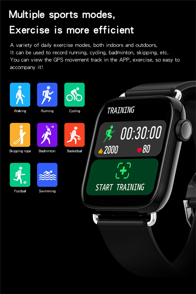 8 видов мультиспортивных режимов (ходьба, бег, езда, скакалка, бадминтон, баскетбол, футбол плавание) функция gps-трека в приложении (часы сами по себе не имеют функции позиционирования GPS)