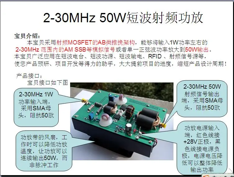 Выход этого усилителяPower50WНапряжение using28V Рабочая currenent4-5A. Вся плата устанавливается на высококачественный алюминиевый радиатор, используйтеРадиочастотная Частотная схема, Высокий коэффициент усиления цепи, стабильный выход, соответствующая схема принимаетШирокополосный трансформатор линии передачи и высокое качество RF core.