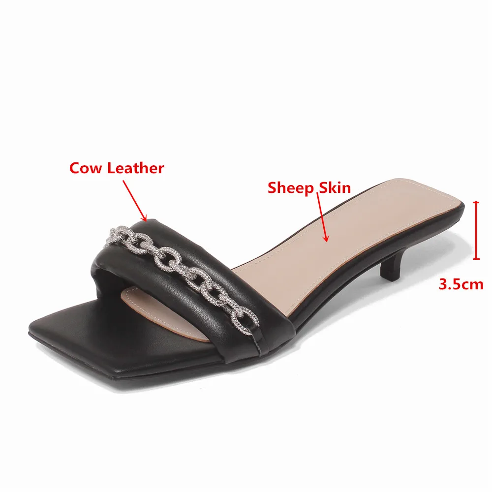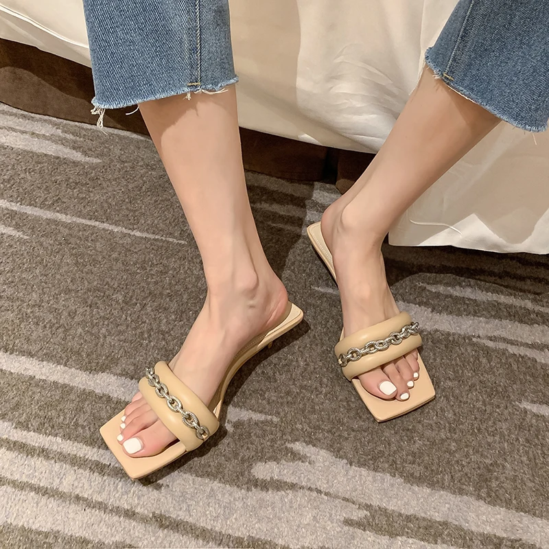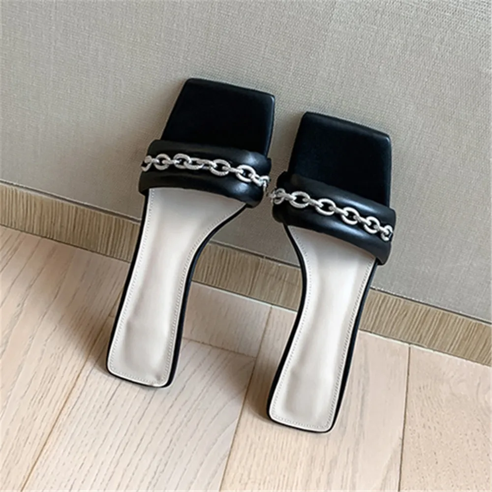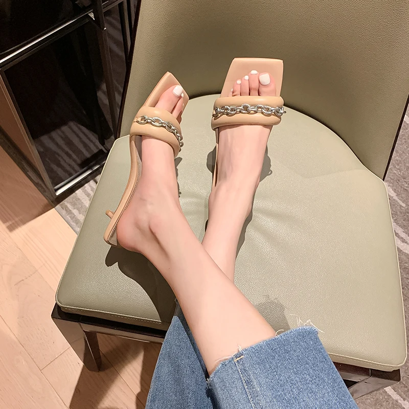 MILI-MIYA; Брендовые шлепанцы на высоком каблуке; Женские модные роскошные сандалии с металлической цепочкой; Летняя женская обувь с квадратным открытым носком; Обувь Черный абрикос