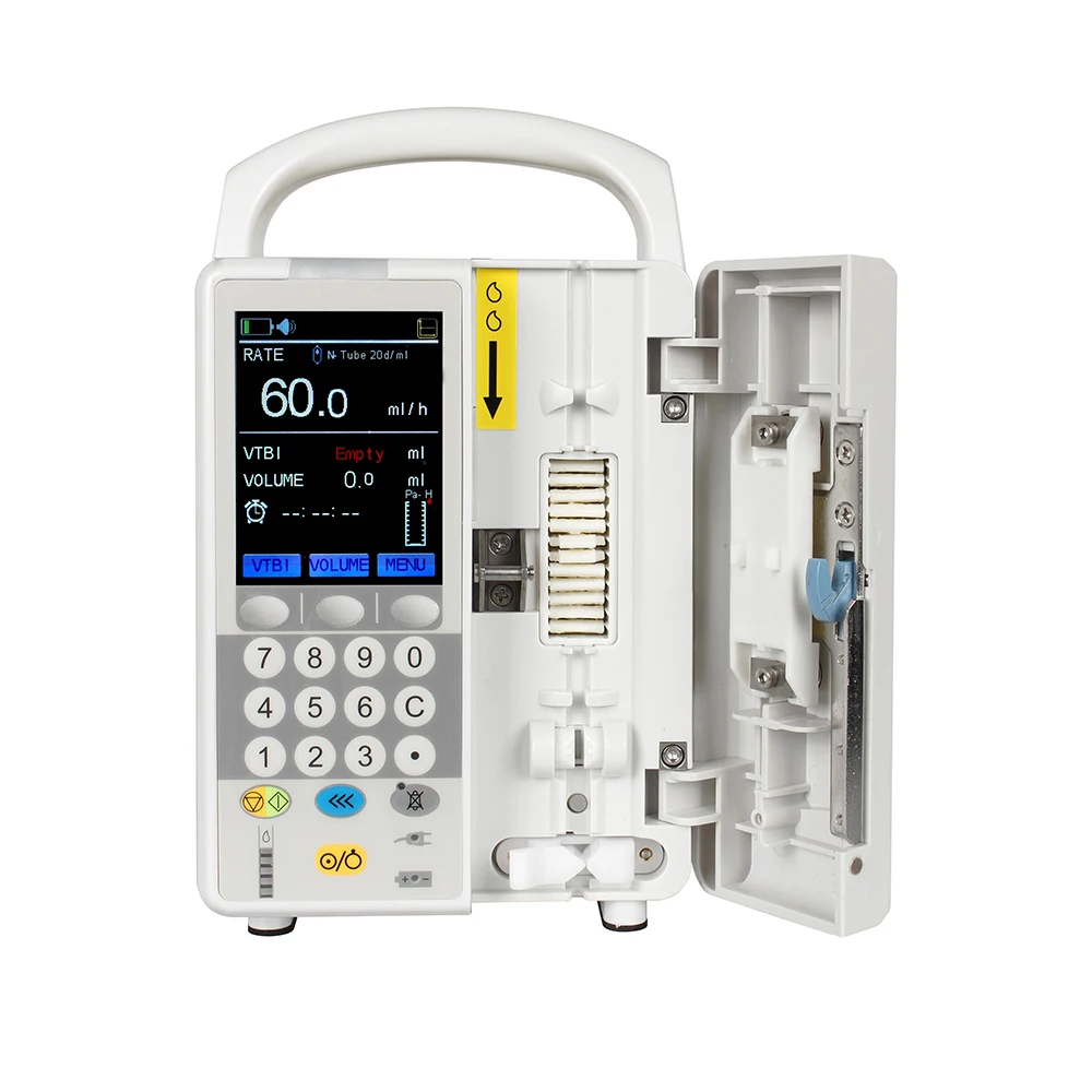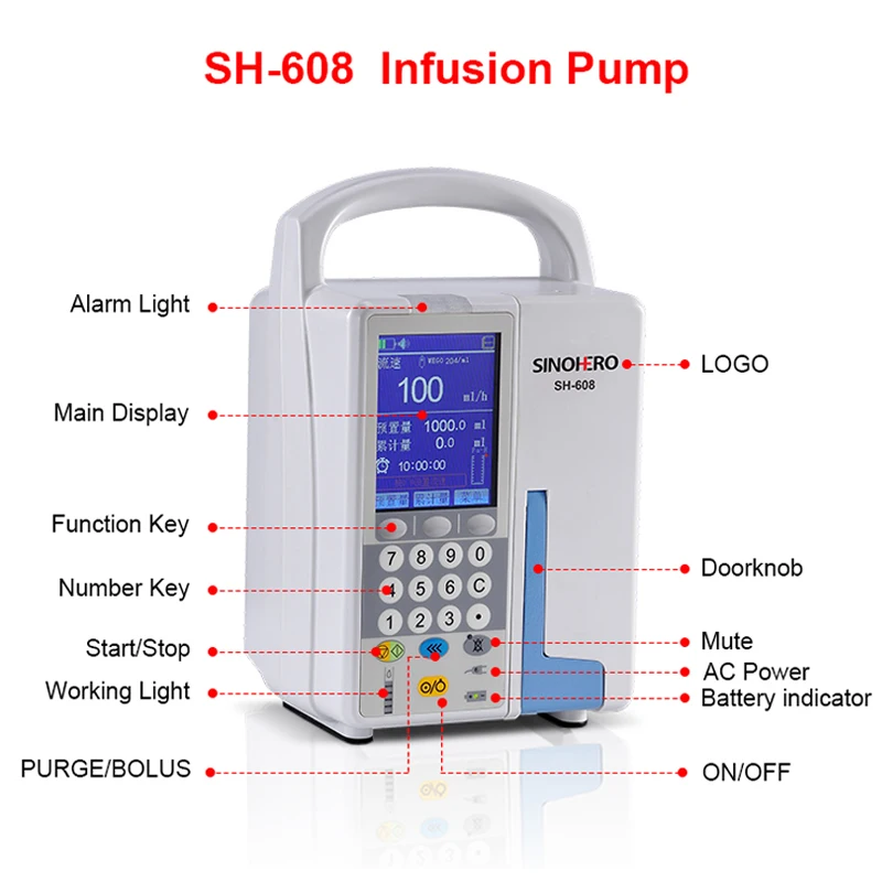 3,2 "Sharp и большой Дисплей гарантирует одновременно просматривать изображение с расстояние Удобный интерфейс для удобства эксплуатации Двойной процессор обеспечивает максимальную безопасность и надежность Точный контроль скорости инфузии и объема инфузии 3 различных режима инфузии отвечают большинству клинических потребностей Большой обзор истории данных и последняя память конфигурации для удобного обзора Система анти-болуса для повышения безопасности инфузии Скорость потока изменяется во время инфузии Библиотека лекарств и беспроводной контроль обновляемый