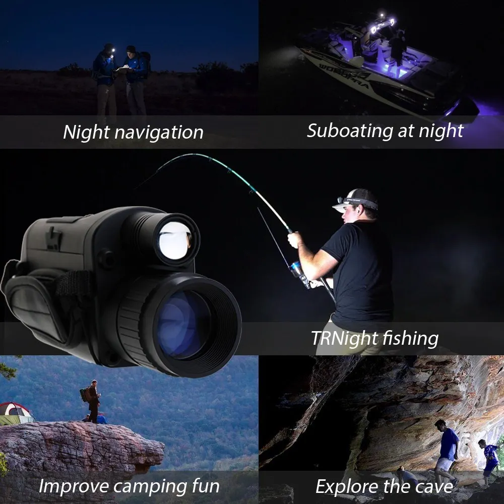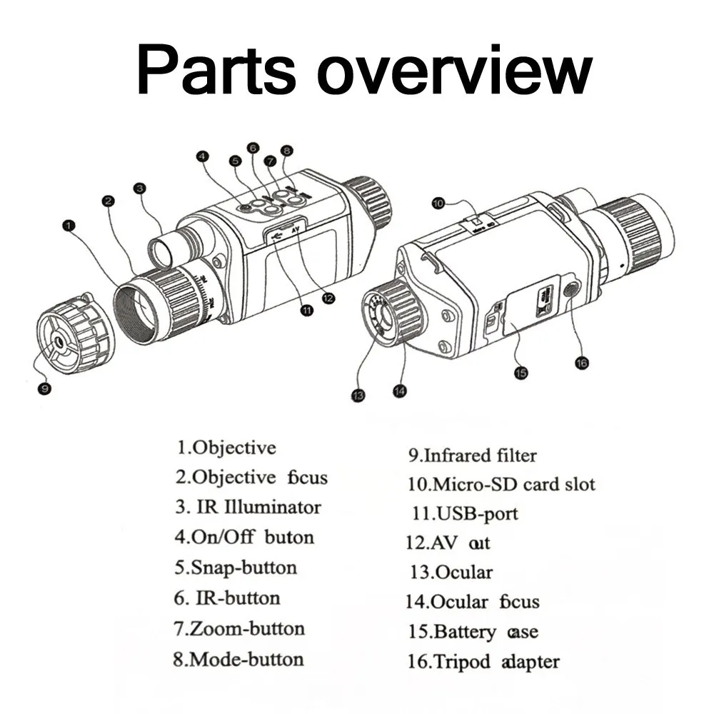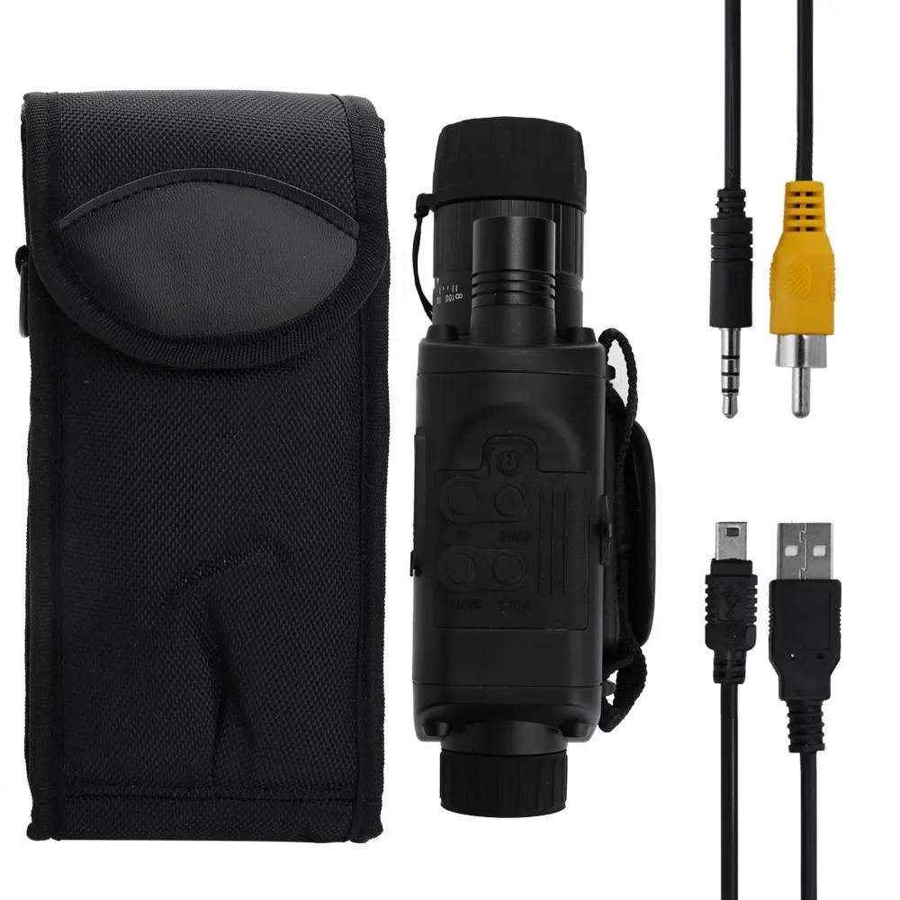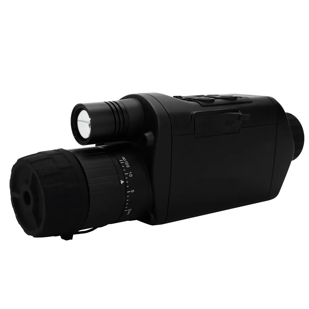 Use this device to view your surroundings in low light conditions or even in complete darkness with the built-in infrared light. You can even take pictures and video using the device which can be stored on a TF card. This device can also be used to take photos and video during the day. Use the supplied A/V cable to view your images on a television or download the images to your computer using the supplies USB cable. Also includes a handy storage pouch. Features: A multifunctional optical device to enhance your vision at night, a bulit-in infrared illuminator provides additional light when in darker conditions, also the infrared strength can be adjusted to suit your situation. Clearly see up to 10.5x magnification in the darkness. Infrared illuminator allows viewing in the dark up to 1000 Feet. Display images and videos on the television. Easily transfer files to a computer. Includes 4GB TF card, USB cable, AV cable, wrist bands and soft carrying case. Suitable for game, improve camping fun or exploring caves, nighttime navigation, night fishing and boating, wildlife observation, etc. Specifications: Optical Performance: Magnification: 3.5-10.5x32 Digital Zoom: 3x Viewing Angle: 9° Objective Aperture: 32mm Exit Pupil Distance: 15mm For Objective Lens: 1.2 Viewing Distance In The Darkness: 1000 ft Diopter Adjustment: +100°- -400° Imager: High Sensitivity: Sensor: CMOS Size: 1/3" Resolution: 1280x720 Displayer: Screen Size: 35" at 2M Resolution Of Screen: 320x240 Lighting System: Luminance: 3W Infrared LED IR Wavelength: 850nm Power: Working Voltage: 4.5V-6.0V Power Source: 4 * AA battery(not included) Video Recording Format: H.264 Signal Processing: Output: USB AV Supporting: NTSC/PAL Storage: TF Card Wireless LAN: 802.11 b/g/n Item Weight: 435g / 0.96lb Package Weight: 695g / 1.53lb Item Size: 210 * 70 * 60mm / 8.3 * 2.8 * 2.4in Package Size: 215 * 140 * 80mm / 8.5 * 5.5 * 3.2in Instruction For Use: Power On: Press the power button still for about 4 seconds to start the Night Vision device. Taking a Photo: Press the MODE button and select the capture photo mode. The iron will appear in the lower right corner of the screen. Press the SNAP button to take photos. Taking Video: Press the MODE button and select the video mode. The iron will appear in the lower right corner of the screen. Press the SNAP button to start recording video and press the Shutter button again to stop recording. Note: When in bright condition, please cover the objective lens with attached IR-Cut cover. When using device in dark conditions, please remove the IR-Cut cover. Watching Stored Videos and Photos: Press the MODE button and select playback mode. You may then toggle through your saved photos/videos with Zoom/Eye buttons. Deleting Stored Videos and Photos: In playback mode, press the IR button. You will be given the option to delete the one image you are viewing on the SD card. Use the SNAP/ZOOM buttons to select yes or no and press IR to delete the image. Package List: 1 * Monocular 1 * USB Cable 1 * A/V Cable 1 * Wrist Bands 1 * Storage Pouch 1 * Manual