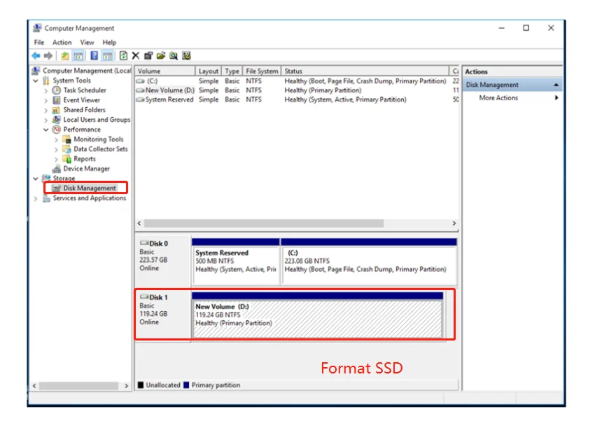 Пожалуйста, отформатируйте и Разделяйте чехол при использовании SSD (щелкните правой кнопкой мыши «Мой компьютер-управление-хранение-управление диском)
