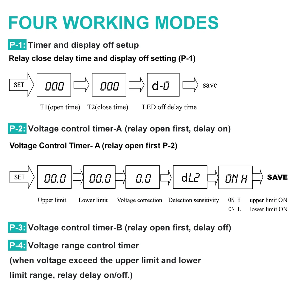 Обеспечивает 4 режима работы: P-1, реле времени задержки закрытия и настройки дисплея; P-2, таймер управления напряжением A (Задержка включения); P-3, таймер управления напряжением B (задержка выключения); И P-4, контроль диапазона напряжения.