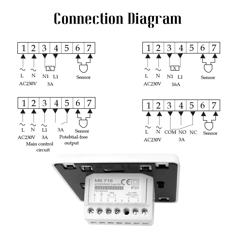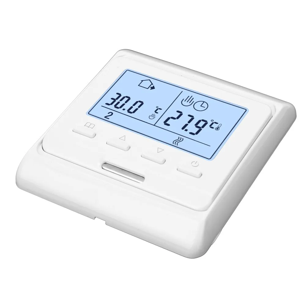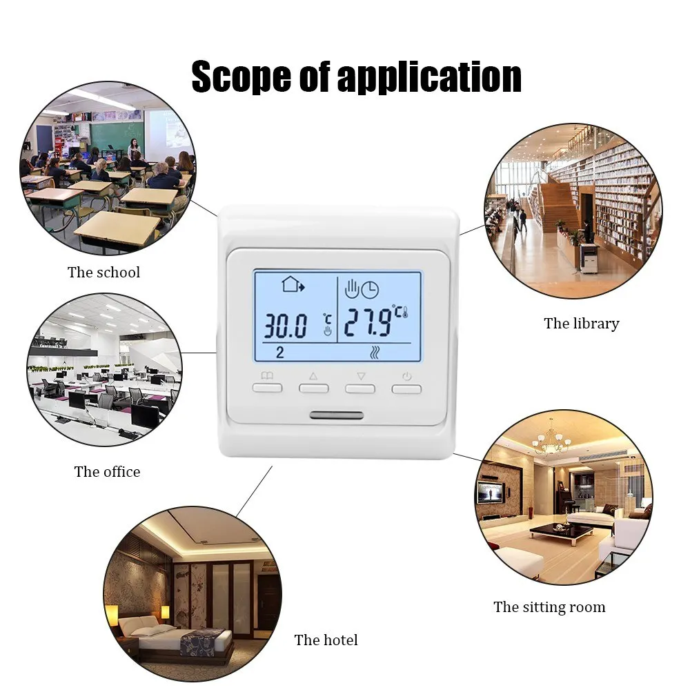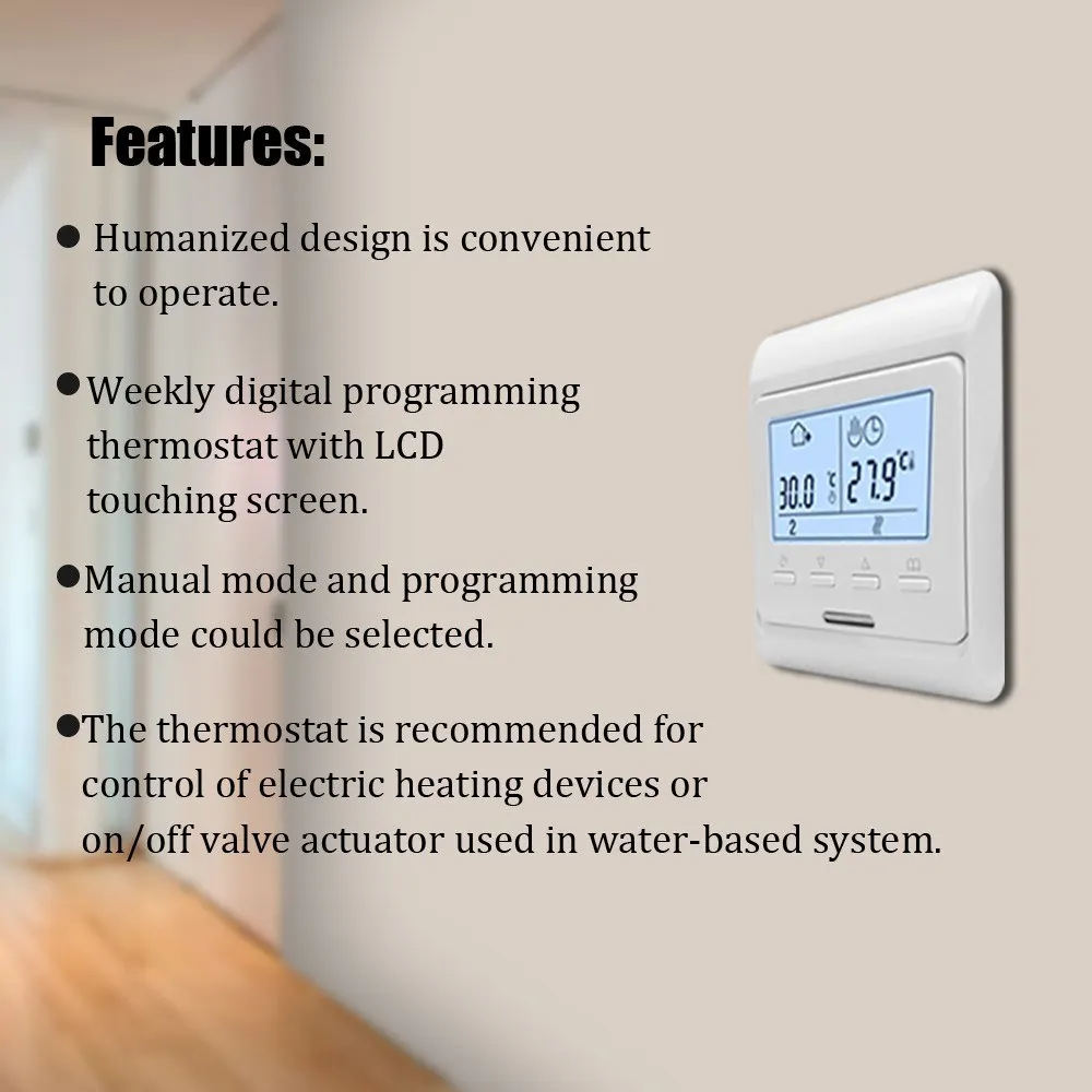 Еженедельный термостат с цифровым программированием является многофункциональным и использует термостат внутри или снаружи с высокоточным датчиком для определения температуры и сравнения с установочным номером, автоматическое включение/выключение нагревательного устройства для сохранения равномерной температуры в помещении. Особенности: Еженедельный термостат для цифрового программирования с сенсорным ЖК-экраном. Можно выбрать ручной режим и режим программирования. Антивоспламеняющийся Материал корпуса ПК. Гуманизированный дизайн удобен в эксплуатации. Большой размер отверстия устойчив и прост в установке. С помощью термостата внутри или снаружи датчика высокой точности для определения температуры и сравнения с номером настройки, автоматически включается/выключается нагревательное устройство, чтобы держать при равномерной температуре внутри. Термостат рекомендуется для Управления Электрическими нагревательными устройствами или приводом клапана вкл/выкл, используемым в водной системе. Основная функция: настройка температуры в помещении, функция коррекции температуры, функция отключения памяти, двойная температура и функция двойного контроля. Характеристики: Мощность: менее 2 Вт Рабочее напряжение: 220 В Выход сигнала: 0,3 мА Способ установки: скрыть установку Погрешность измерения: 0.1% Точность контроля температуры: ± 1 ℃ Тип управления: температура и влажность Диапазон температур: 10 ℃ - 35 ℃(℃) Диапазон влажности: 0 ℃ - 99 ℃(%) Уровни защиты: IP20 Материал корпуса: огнестойкий Поликарбонат Размер отверстия для установки: 60 мм/2,4 дюйма Товар Размеры: 86*86 мм/3,4 * 3.4in Размер посылка: 100*95*65 мм/3,9*3,7*2,6 дюймов Посылка Вес: 320 г/11,3 унции Примечание: Допускается ошибка в 1–3 мм из-за измерений вручную Из-за разницы между различными мониторами изображение может не отражать фактический цвет изделия. Посылка: 1 * термостат