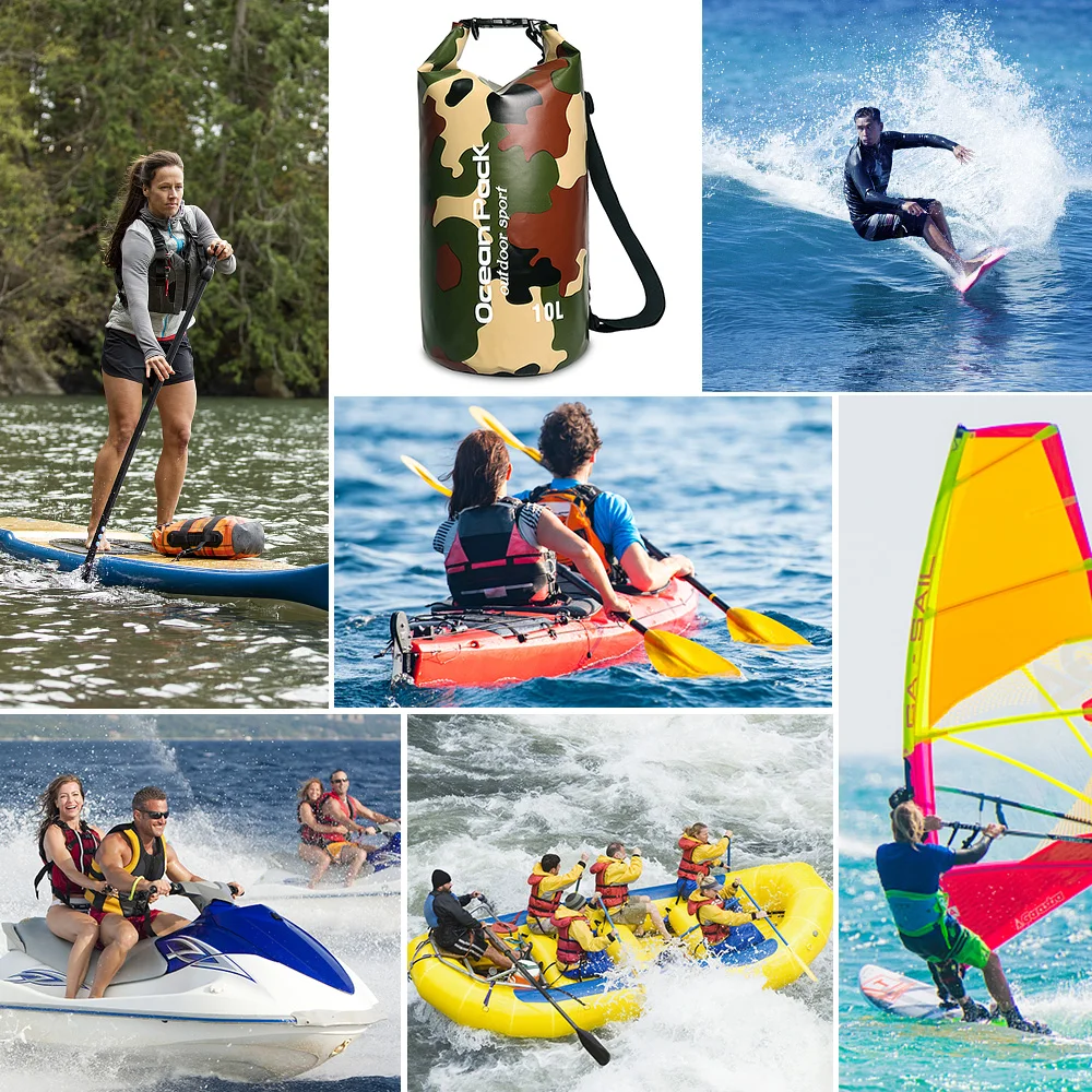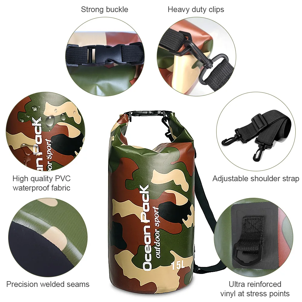 Изготовлен из износостойкого ПВХ материала. Имеет большой основной отсек с закрытием в рулоне, защищает ваши ценные вещи от воды и дождя. Отличный выбор для пляжа, катания на лодках, рафтинга, каякинга, плавания, серфинга и т. д.