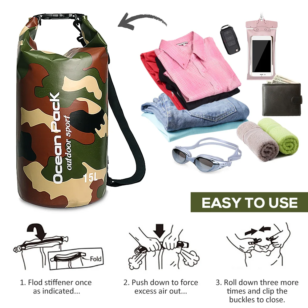 Простое управление, просто положите свое снаряжение в сумку, плотно закатайте 2-3 раза, а затем Подключите пряжку для завершения уплотнения.