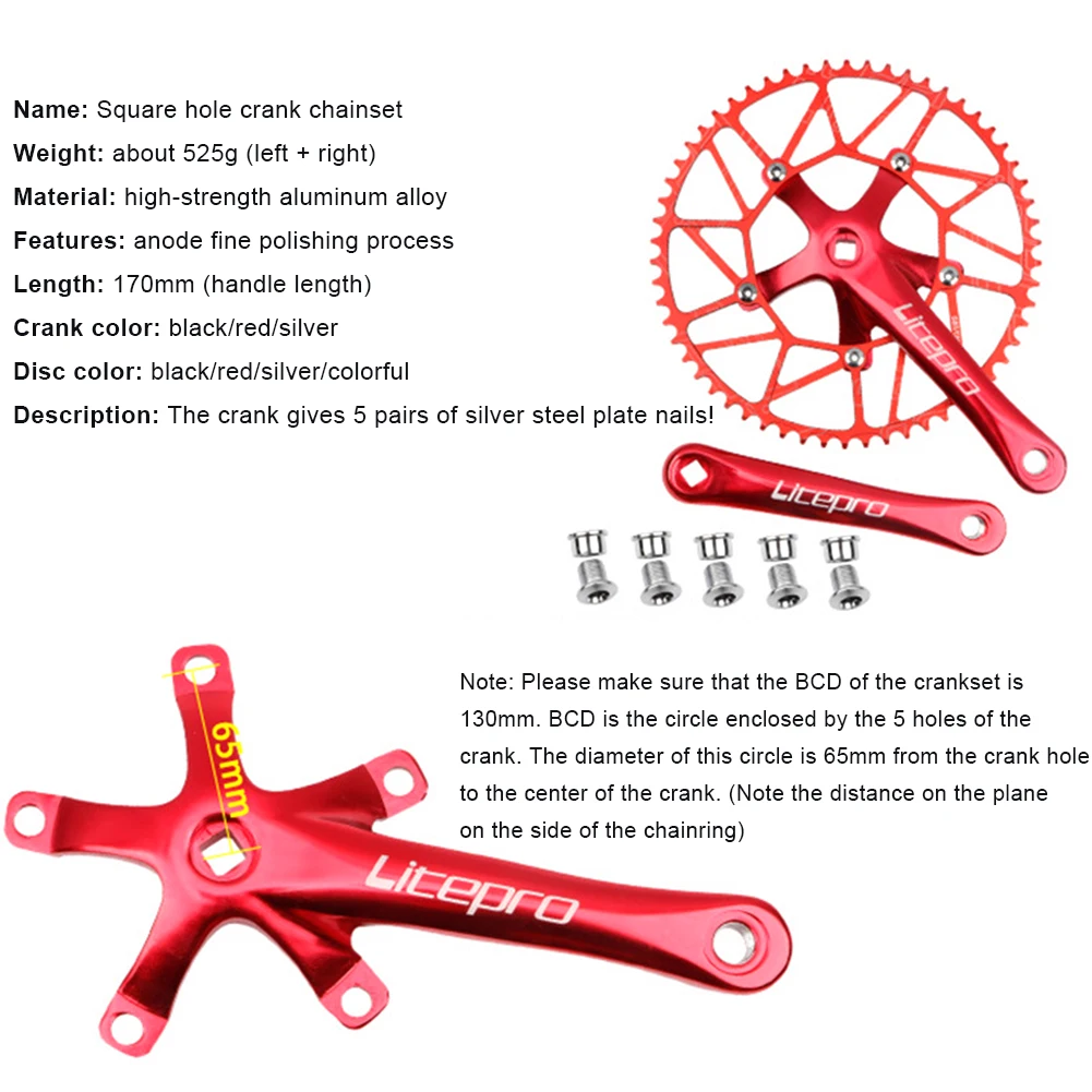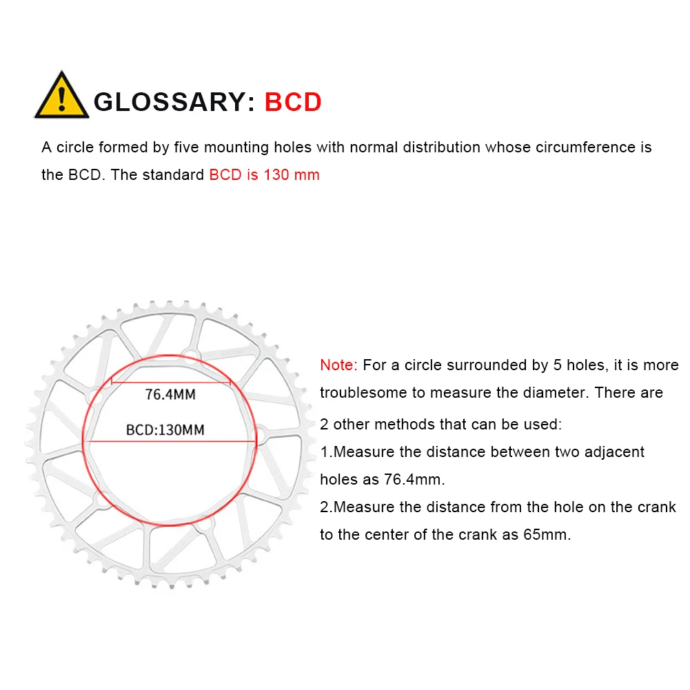 * 2. Цепная цепь: BCD-130 мм, Teeth-50T/52T/54T/56T/58T (опционально), совместимая цепь: 9/10/11 скорость, диаметр: 208/216/224/234/242 мм