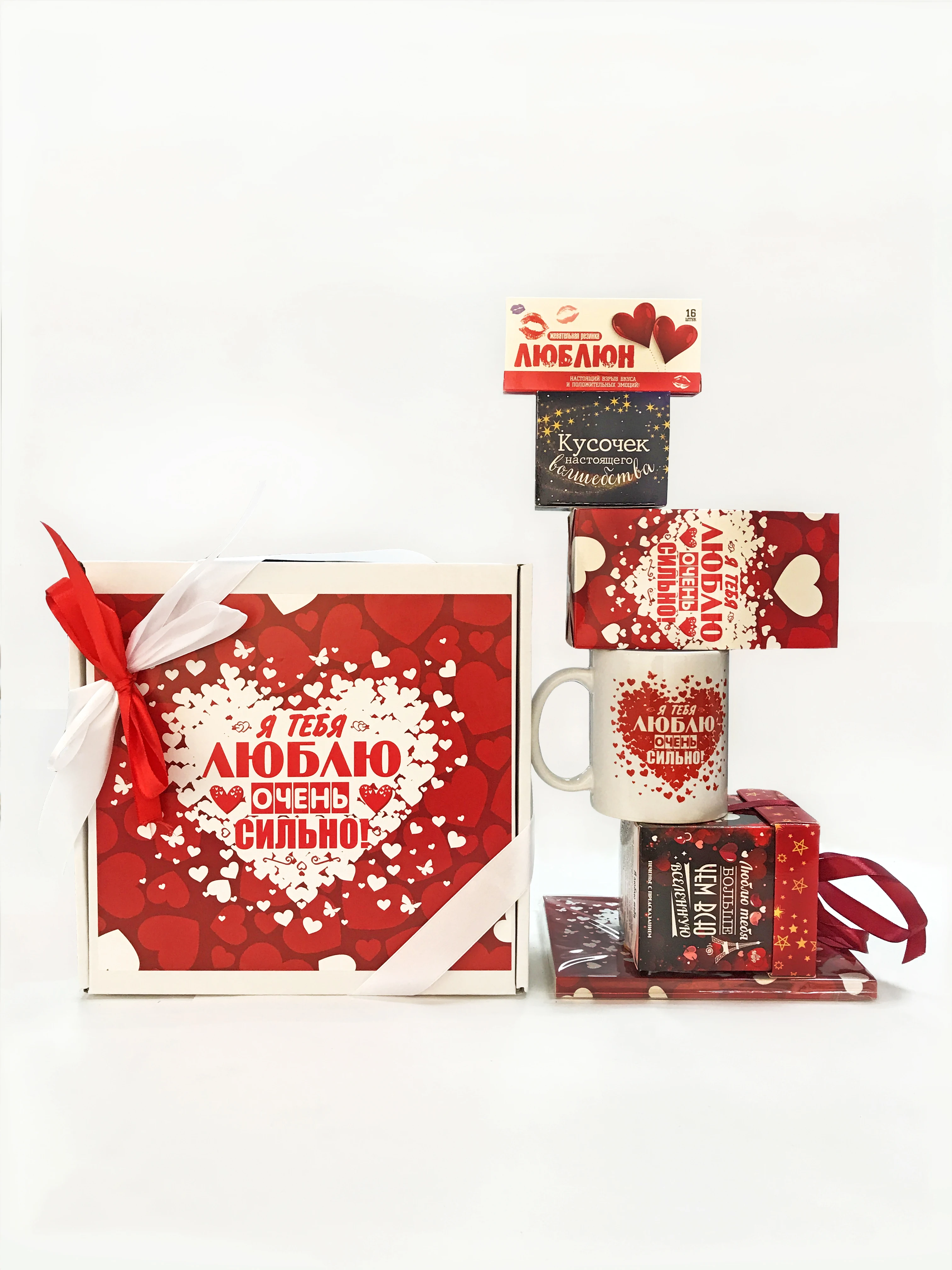 Шоко-набор на 12 пл.; шоко-открытка на 4 пл.; шуточная жвачка; печенье с предсказанием н 5 шт; шоко-открытка на 1 пл.; чай подарочный; печенье с предсказанием на 1 шт; карточка; кружка керам.; маршмеллоу
