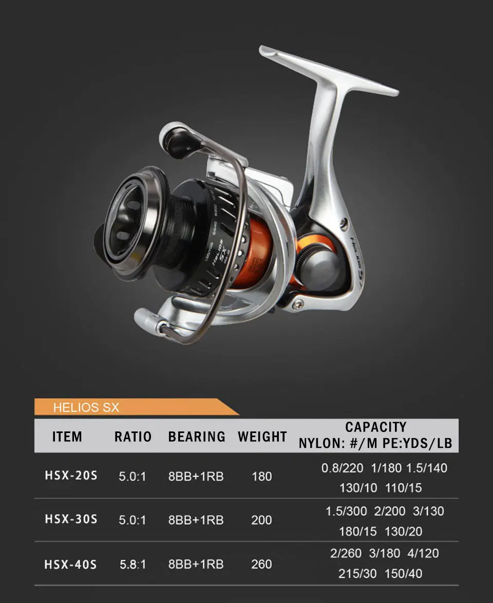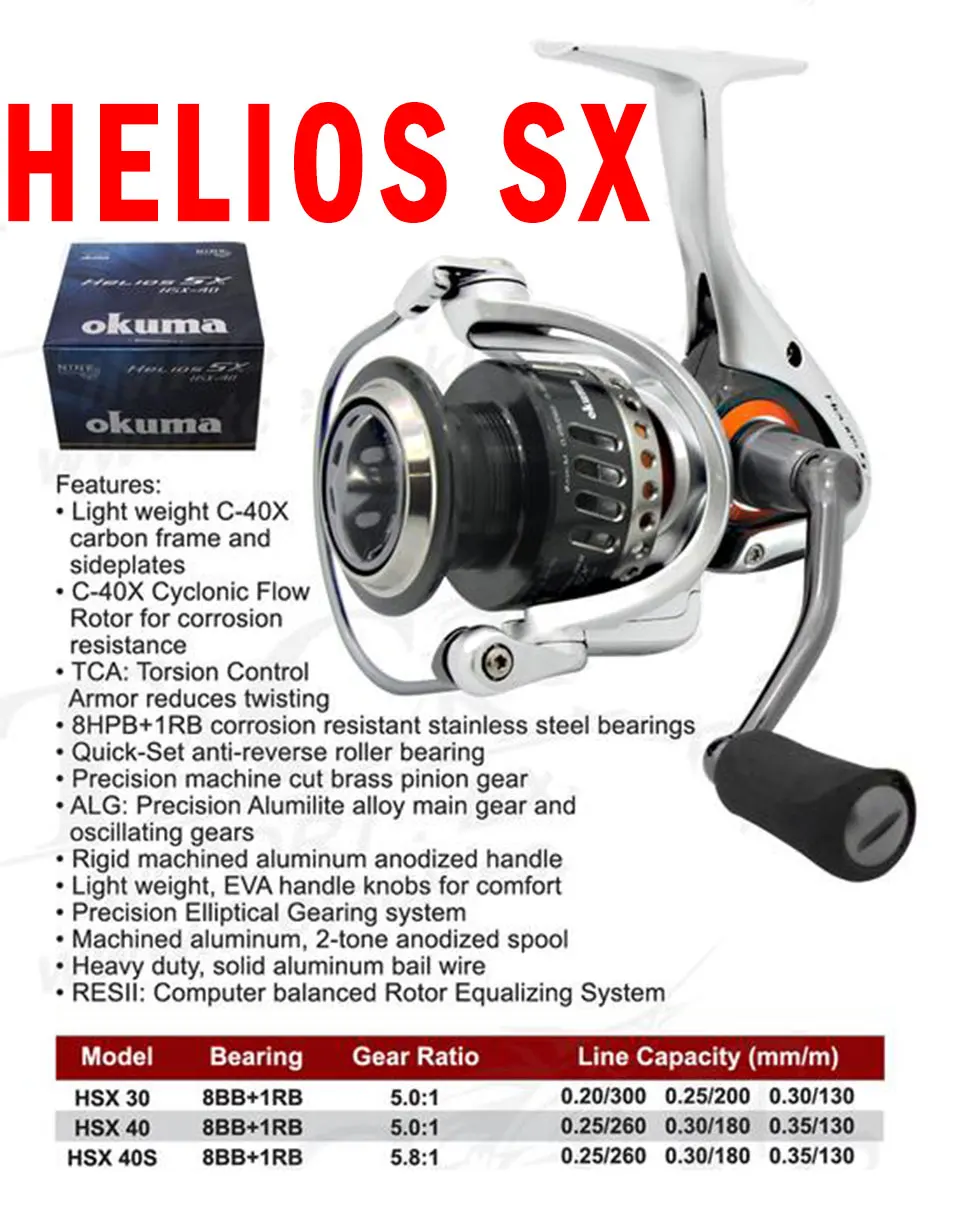 Спиннинговые Катушки Okuma Helios SX изготовлены из C-40X углерода, а конструкция брони управления кручением делает катушку чрезвычайно жесткой и более легкой, также Уменьшите поворот и крутящий момент и держите внутренние части в идеальном выравнивании для пресной воды и морской рыбалки.