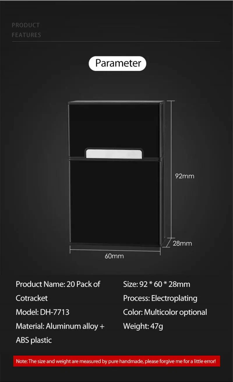 Хорошее качество, сопротивление сжатия и отсутствие деформации, более сопротивление сжатия и износостойкость, чем традиционные портсигар, сигареты не будут раздавлены или сломаны
