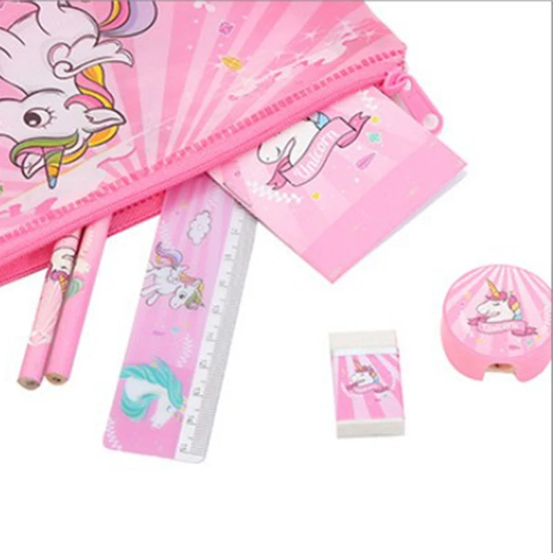 Product size: Stationery bag: 19*10cm Pencil: 17cm Ruler: 15cm Scratch pad: 9*6cm Rubber: 3*2cm Pencil Sharpener: 3cm in diameter
