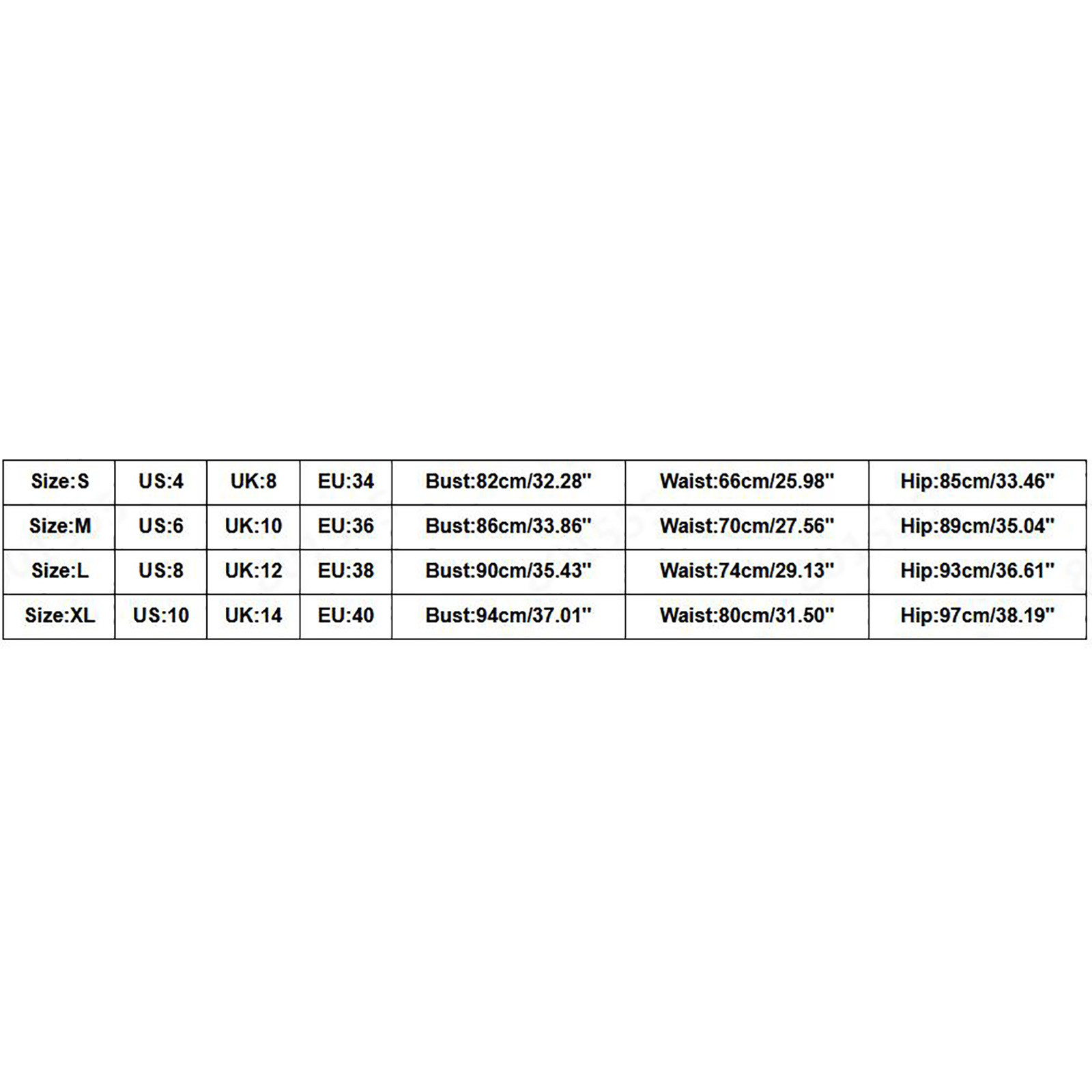 Размер США Великобритания ЕС Бюст Талия Бедра S 4. 8 34 82 см/32,28'' 66 см/25,98'' 85 см/33,46'' М 6 10 36 86 см/33,86'' 70 см/27,56'' 89 см/35,04'' L 8 12 38 90 см/35,43'' 74 см/29,13'' 93 см/36,61'' XL 10 14 40 94 см/37,01'' 80 см/31,50'' 97 см/38,19''