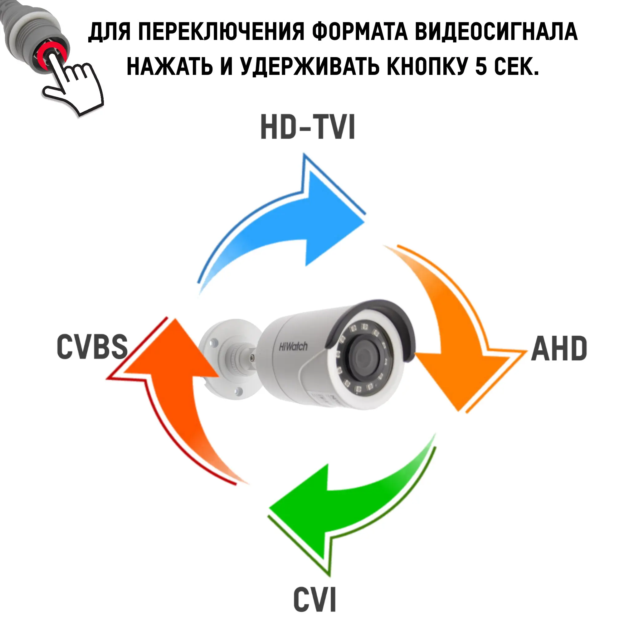 Камера видеонаблюдения поддерживает все форматы видеоизображения HD-TVI, CVI, AHD, CVBS переключение производится с помощью кнопки на камере.