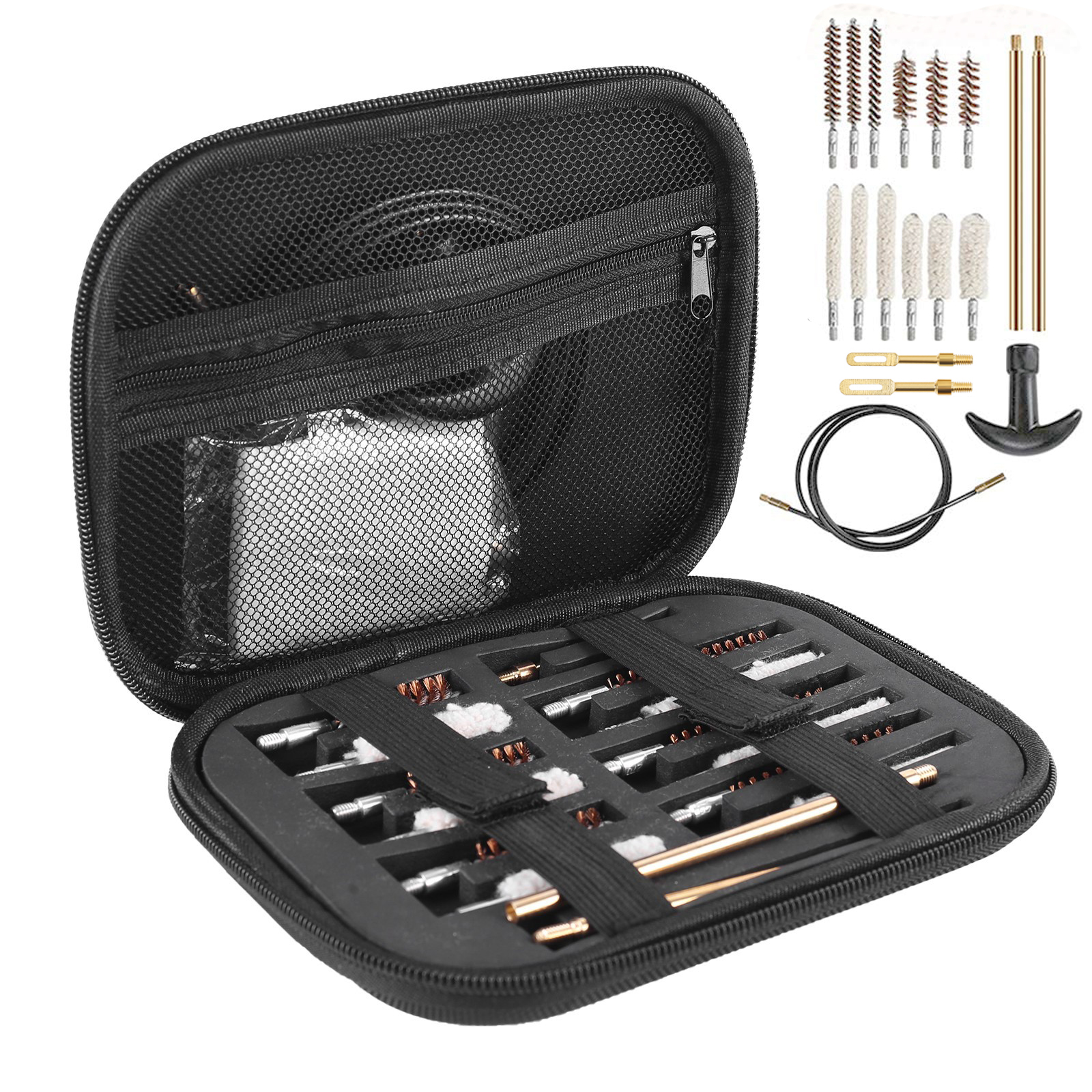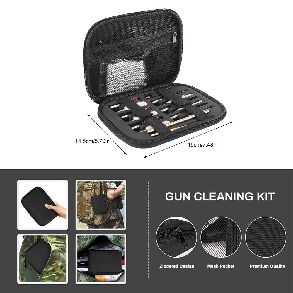 [Высокое качество]: 19-кусок и пистолета система обслуживания в высокопроизводительный молния Коробка для хранения, Компактный Мягкий коробка с застежкой-молнией может вместить все необходимые инструменты для чистки, все предметы аккуратно и надежно закреплены на месте. Размер коробки для хранения составляет 7,48 "x 5,71" x 1,38 ", что не занимает много места и легко переносится.
