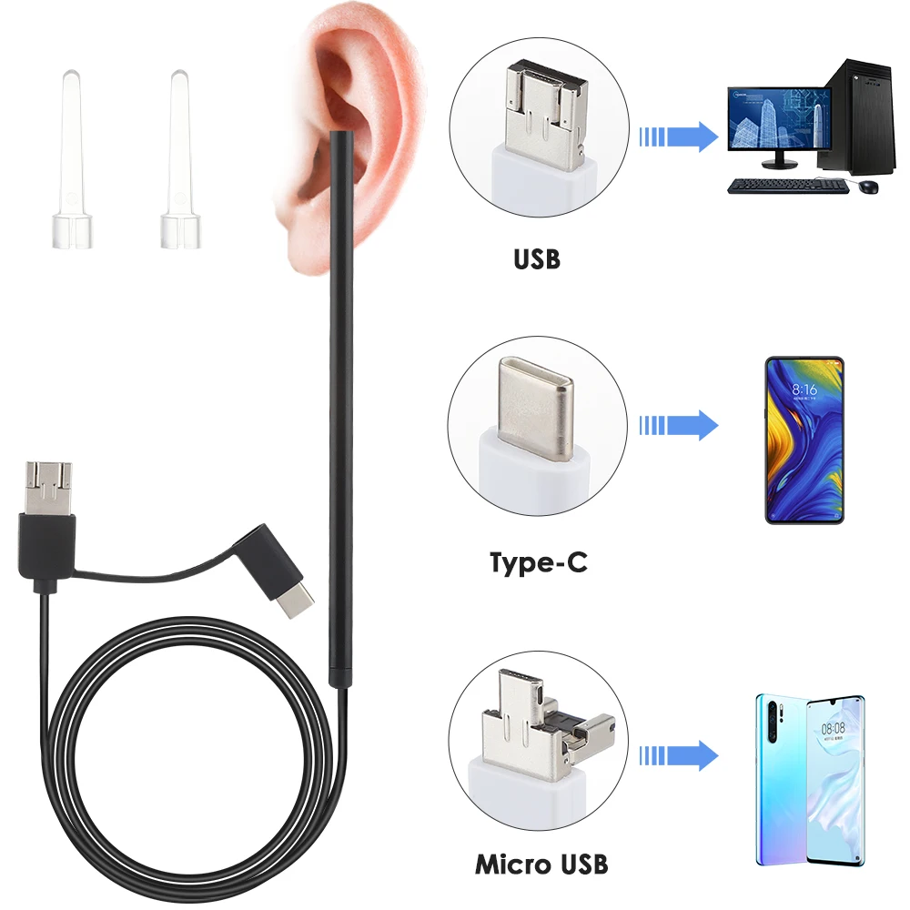 Многофункциональный Цифровые микроскопы высокой четкости визуальный наушник 5,5 мм ушному каналу светильник-излучающие эндоскоп медицинский ушной термометр очистки эндоскопа Ложка Мини Камера очистителей для удаления ушной серы визуальный ухо рот нос Поддержка Android ПК 1 метр
