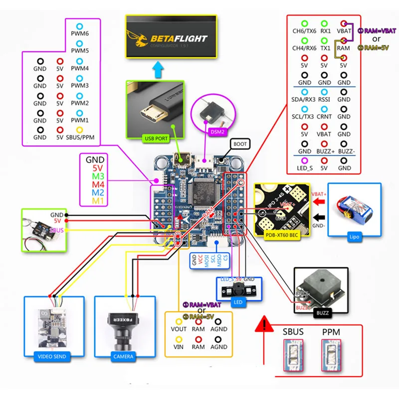 Интерфейс VBAT поддерживает доступ аккумулятора 2-4S к управлению полетом.