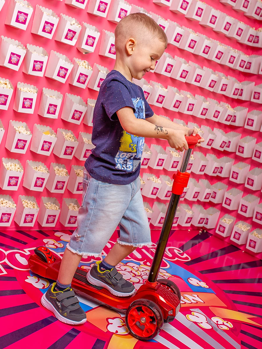Складной 3-х колесный самокат-машина RUSH ACTION для детей от 3-х лет. Модель имеет световые и звуковые эффекты. Широкая платформа с прорезиненной накладкой исключает риск травмирования ребенка. Размер платформы 58-14 см. Полиуретановые светящиеся колёса жёсткостью 82А с прочными подшипниками ABEC 7 обеспечивают плавную езду, Диаметр колес: 135 мм, 90 мм. Регулируемая высота алюминиевого руля от 65 до 82 см. Максимальная нагрузка на самокат 50 кг. Тормоз задний - наступающий (step-on brake). Вес 3,6 кг.