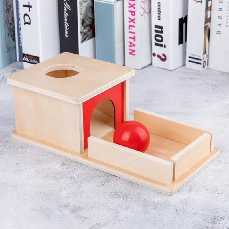 Ребенок должен уронить маленький шарик в отверстие в коробке. Шар выкатится из коробки и в Прикрепленный лоток.