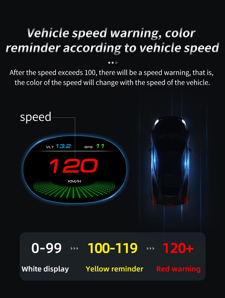 2. Отображение информации о режиме GPS: скорость, время в пути, Спутниковое время, высота, количество спутников, направление движения, один пробег, напряжение, испытание на ускорение, испытание тормозов.Сигнализация: сигнализация с превышением скорости, сигнализация с низким напряжением, свободное переключение между километром и милями.Способ навигации:Необходимо загрузить программное обеспечение приложения, HUD и смартфон для беспроводного подключения по Bluetooth, информация о навигации будет отображаться синхронно через приложение