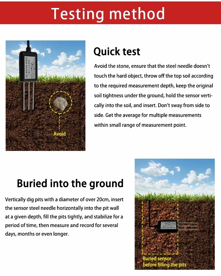 Простота в использовании: он может быть непосредственно похоронен в грунте и не подвержен коррозии. Или просто вставьте зонд в почву для проверки качества почвы.