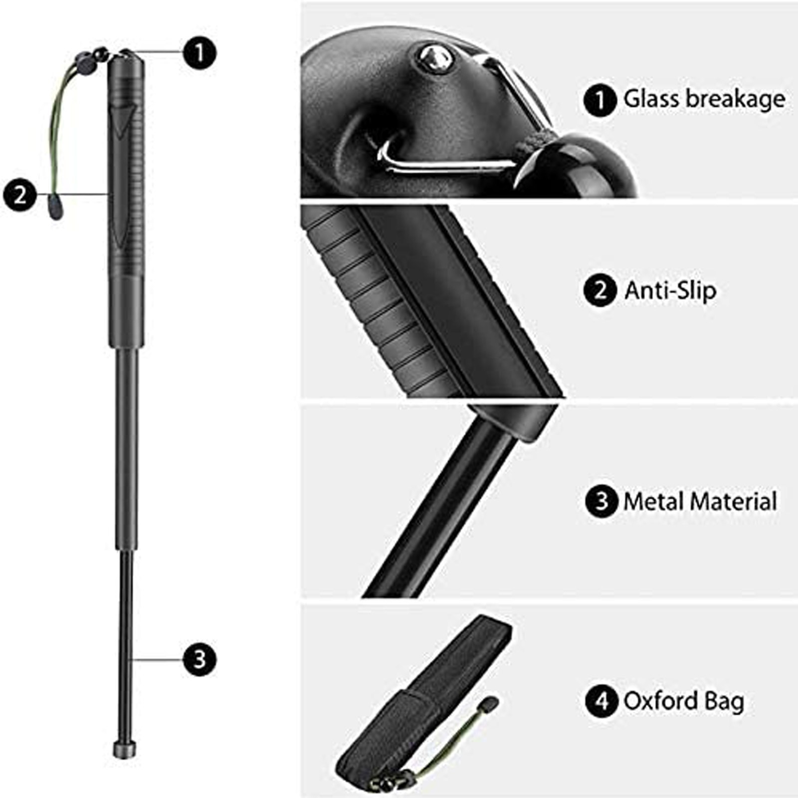 Аварийный выход-конический конец телескопического стержня подходит для быстрого выхода из опасности и облегчает поломку стекла в чрезвычайных ситуациях.Для полного расширения полюса-качели с силой. Как полностью оттянуть: Ударьте конец полюса на твердом месте.