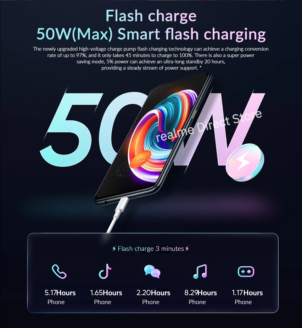 Новая усовершенствованная технология зарядки с высоким напряжением может достичь коэффициента преобразования зарядки до 97%, и это занимает всего 45 минут, чтобы зарядить до 100%. Существует также супер энергосберегающий режим, 5% мощности может достичь сверхдлительного ожидания 20 часов, обеспечивая устойчивый поток поддержки питания *.