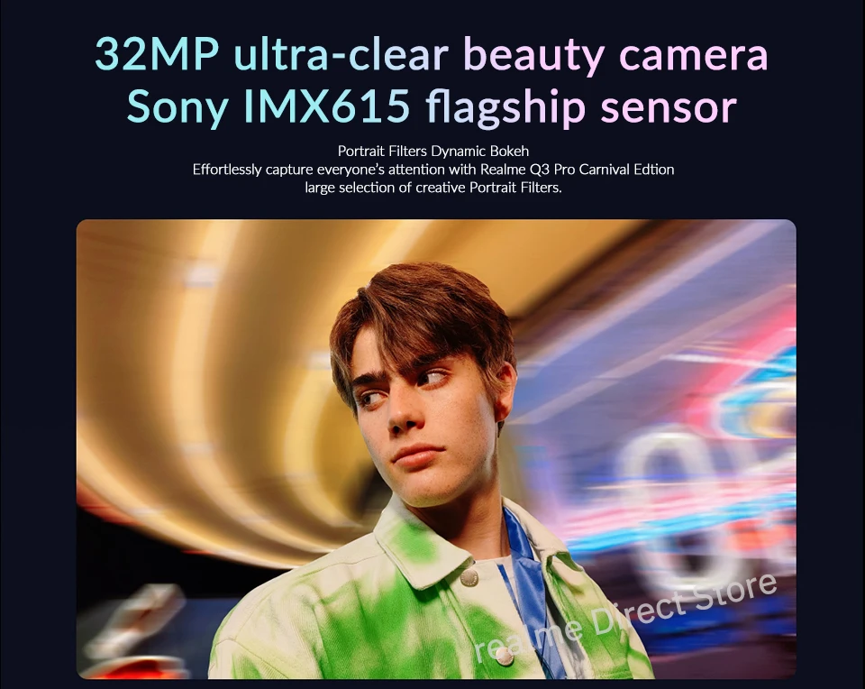 Легко запечатлейте внимание всех с помощью Realme Q3 Pro Carnival Edtion большой выбор креативных портретных фильтров.