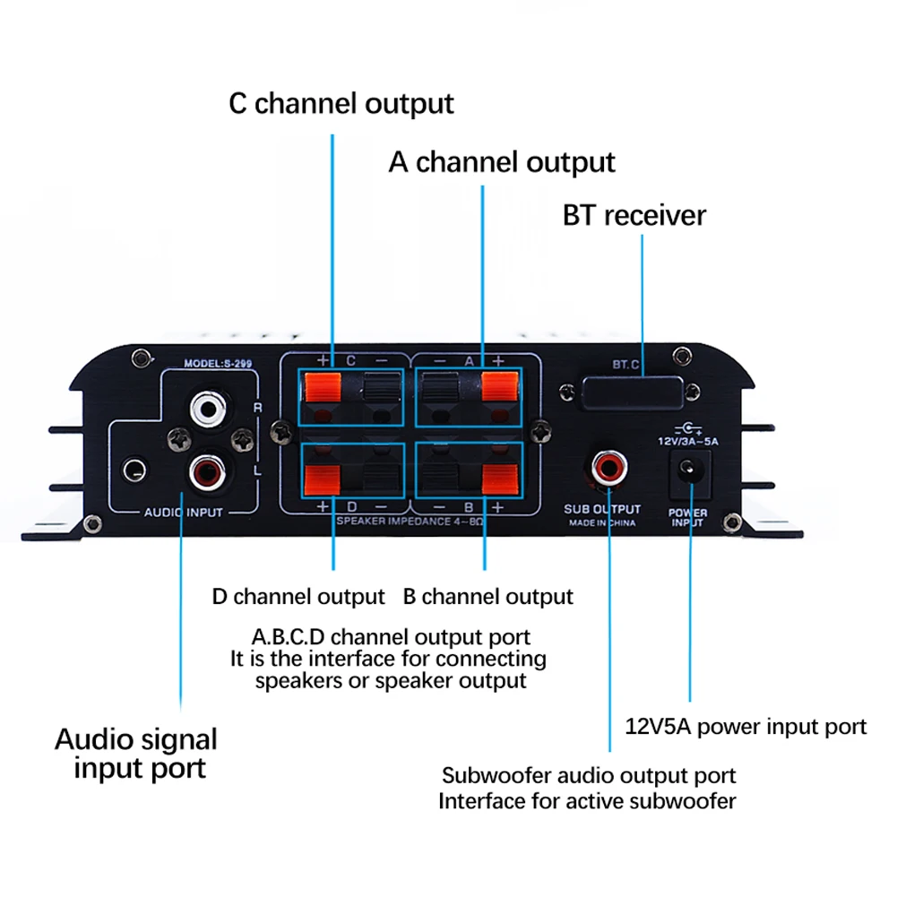 Кроме того, подключается к четырем динамикам с номинальной мощностью 40 Вт, он также может быть подключен к активному сабвуферу, который не имеет ограничения мощности.