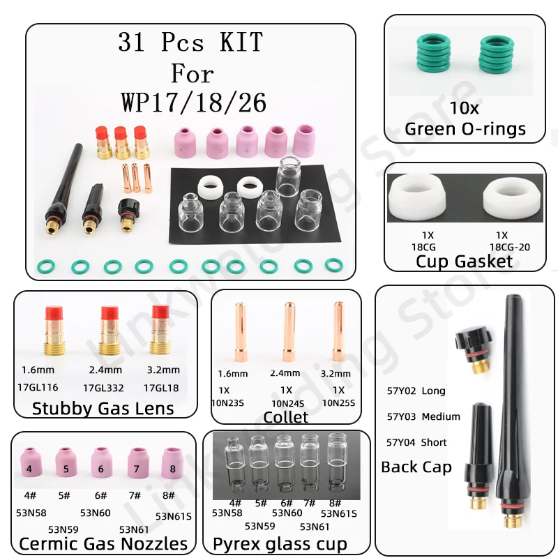 Набор для сварки Tig, газовая линза, пустышки, корпус, стеклянная чашка Pyrex для tig, фонарь wp17/18, электрод tig wp 26, сварочные аксессуары