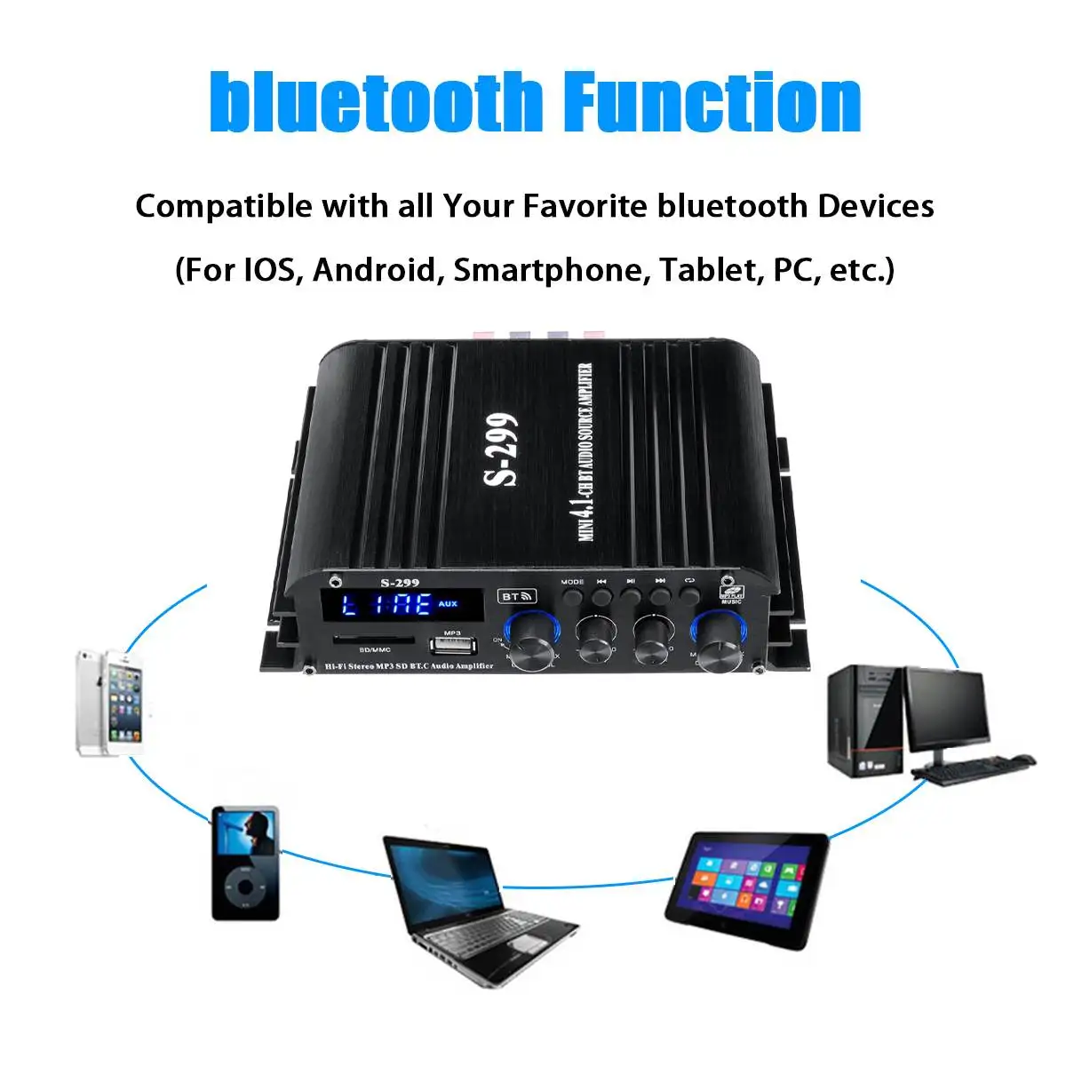 -Sd-карта, u-диск, AUX, MP3 формат воспроизведения, Поддержка беспроводного подключения bluetooth.