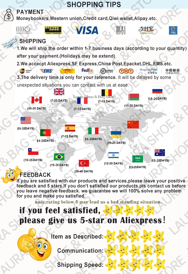 О возврате и возврате:Если вы хотите вернуть или обменять товар, пожалуйста, свяжитесь с нами в течение 7 дней после получения обуви (на основании даты подписания логистики). Товар должен быть в их первоначальном состоянии (стоимость доставки и обработки не возвращается). Человеческий дефект не гарантирован, такой как сломанный, поцарапанный и так далее.