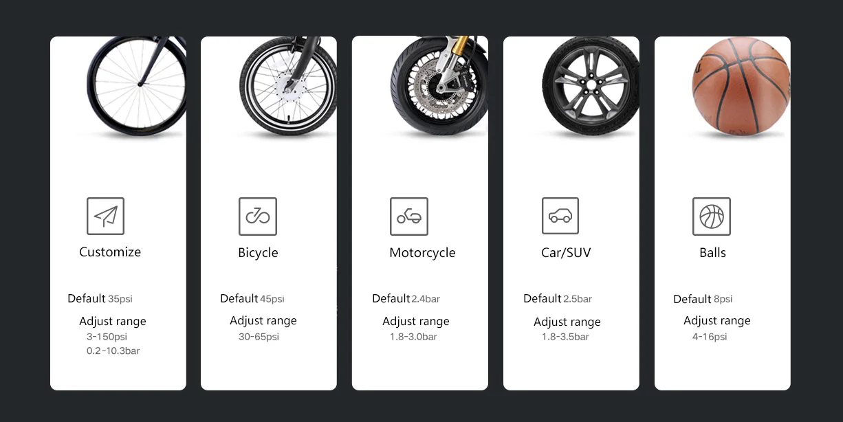 Пять различных режимов надувания-каждый с предустановленными значениями давления воздуха-предотвращает чрезмерную инфляцию и обеспечивает душевное спокойствие. Это делает портативный Электрический воздушный компрессор Xiaomi 1S простым в использовании.