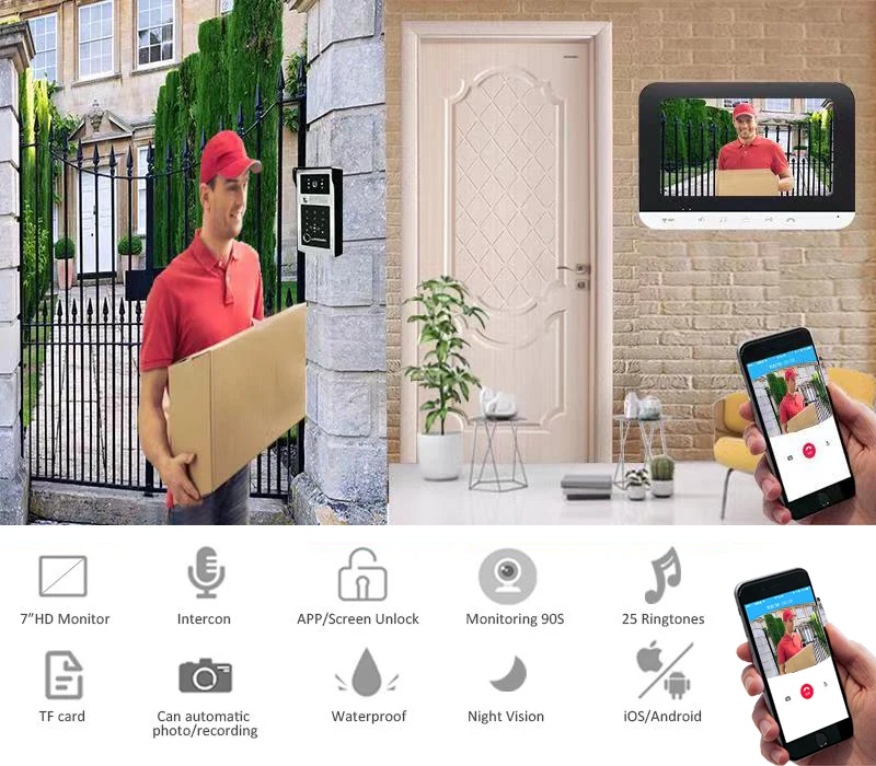 Гарантия: (sunflowerrdp)2 года гарантии на товары и аксессуары! И 5 лет гарантии бесплатного ремонта!*** Мы тестируем все товары более трех раз перед отправкой, все упаковки будут очень прочными!*** Мы оплатим стоимость ремонта, бесплатные запчасти и стоимость доставки из Китая на ваш адрес в пределах гарантии!*** Все наши товары покрываются в течение 7 дней без причины для возврата, товар может обменять или получить возврат только при хорошем состоянии в течение 7 дней!Название продукта: 7-дюймовый внутренний монитор Wi-Fi (может работать с приложением для телефона) + карты отпечатков пальцев/IC/код разблокировки наружной камеры для разных квартир.Примечание для работы приложения мобильный телефон