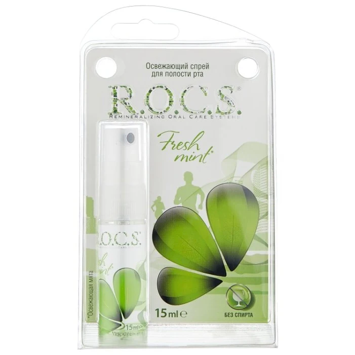 Спрей Rocs Освежающая мята благодаря своему уникальному составу мгновенно и надолго освежает дыхание. Он обладает успокаивающим, заживляющим свойствами, и способствует увлажнению слизистой оболочки полости рта.