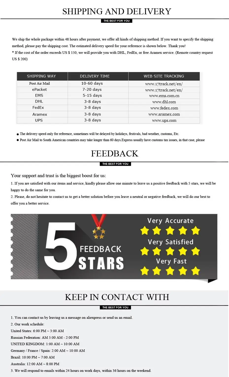 Мы поддерживаем высокие стандарты качества и стремимся к 100% удовлетворенности клиентов! Отзывы очень важны, мы просим Вас немедленно связаться с нами, прежде чем дать нам нейтральный или отрицательный отзывы. Чтобы мы могли удовлетворительно решить ваши проблемы.