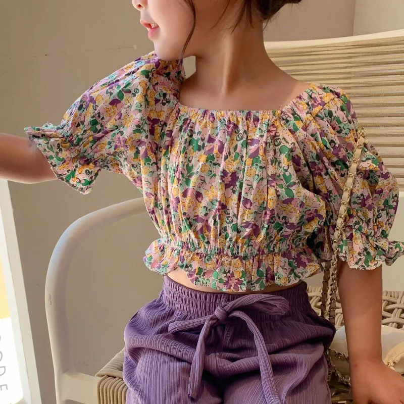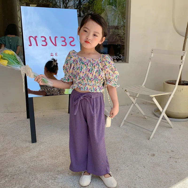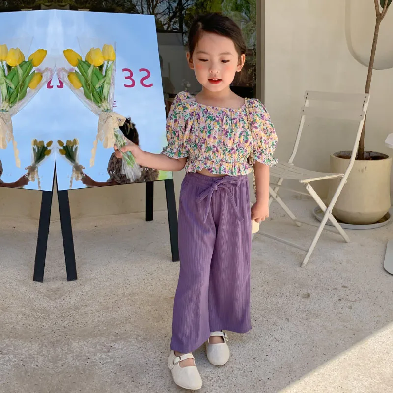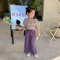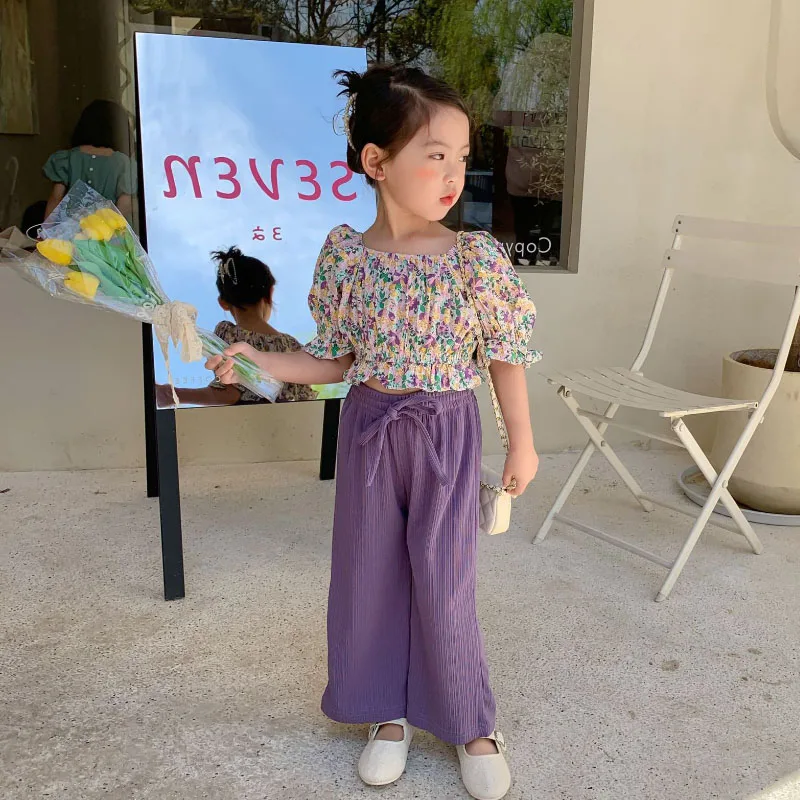 Одежда для девочек летняя спортивная одежда для отдыха из двух предметов, милая футболка с цветочным рисунком + широкие штаны От 2 до 7 лет, модная Высококачественная детская одежда