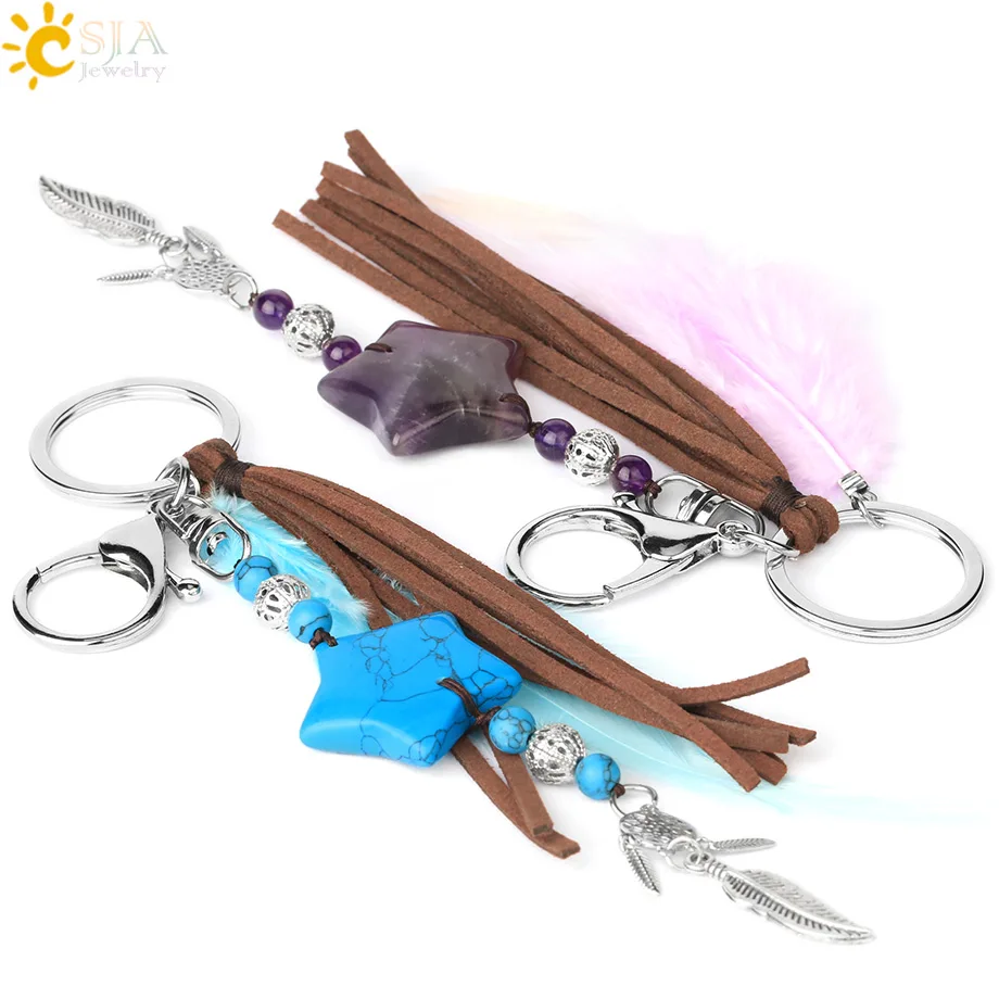 CSJA, натуральный Ловец снов, брелки, Голубое перо, кисточка, пентаграмма, брелок для стены автомобиля, подвесной декор, амулет, Boho, ювелирные изделия, G749
