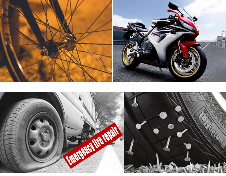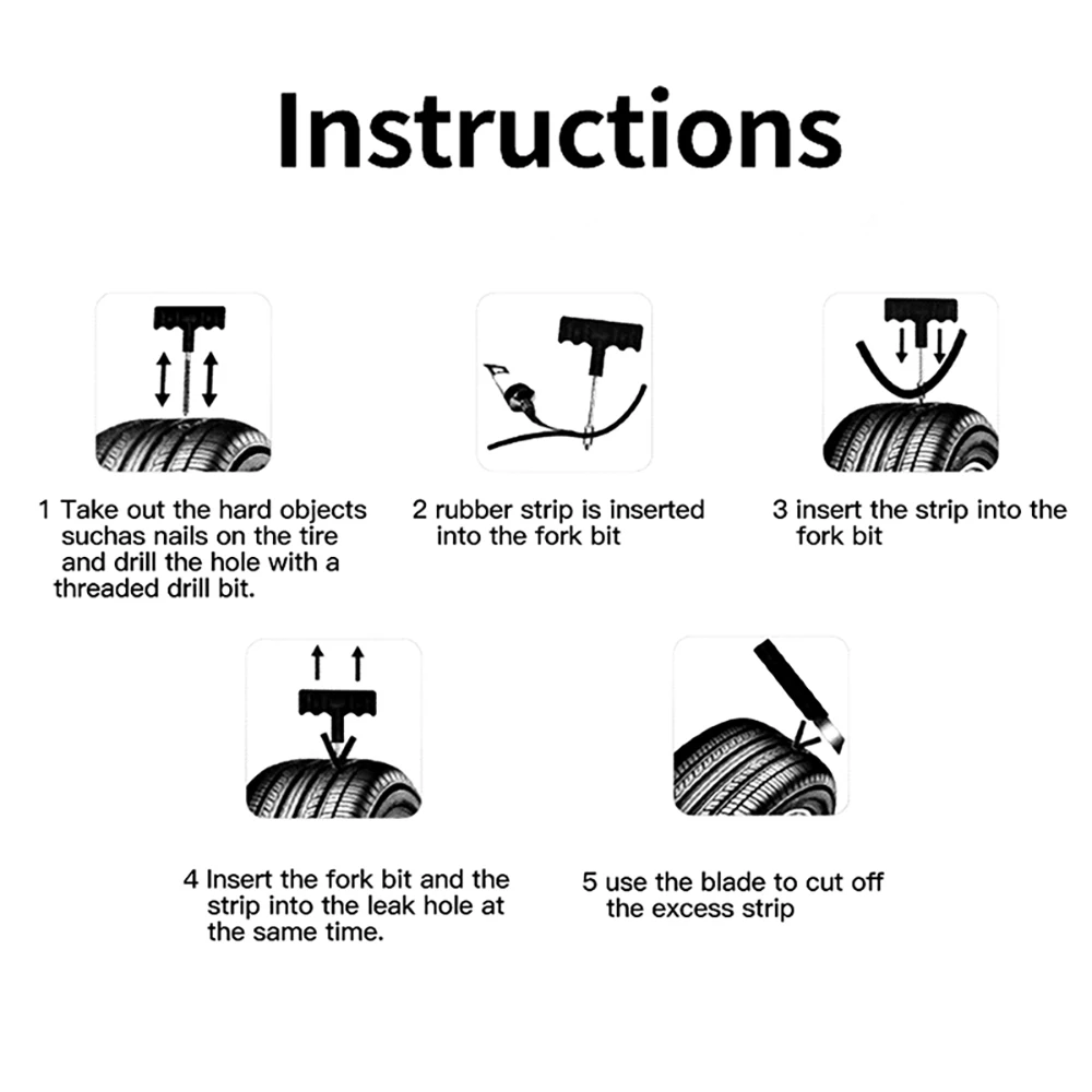 Шаг 1: Удалите шину с помощью тяжелых плоскогубцев. Шаг 2: нанесите смазку на Спиральный зонд с Т-образной ручкой перед использованием, чтобы увеличить площадь прокола. Шаг 3: Оторвите струны с помощью встроенных плоскогубцев, а затем вставьте. Шаг 4: вставьте полосу в шину и поверните на 360 градусов. Оставьте полосу 12 мм снаружи, а затем вытяните иглу. Шаг 5: используйте нож, чтобы обрезать излишки струн с протектором Шины. Шаг 6: повторное надувание шины до рекомендованного давления.