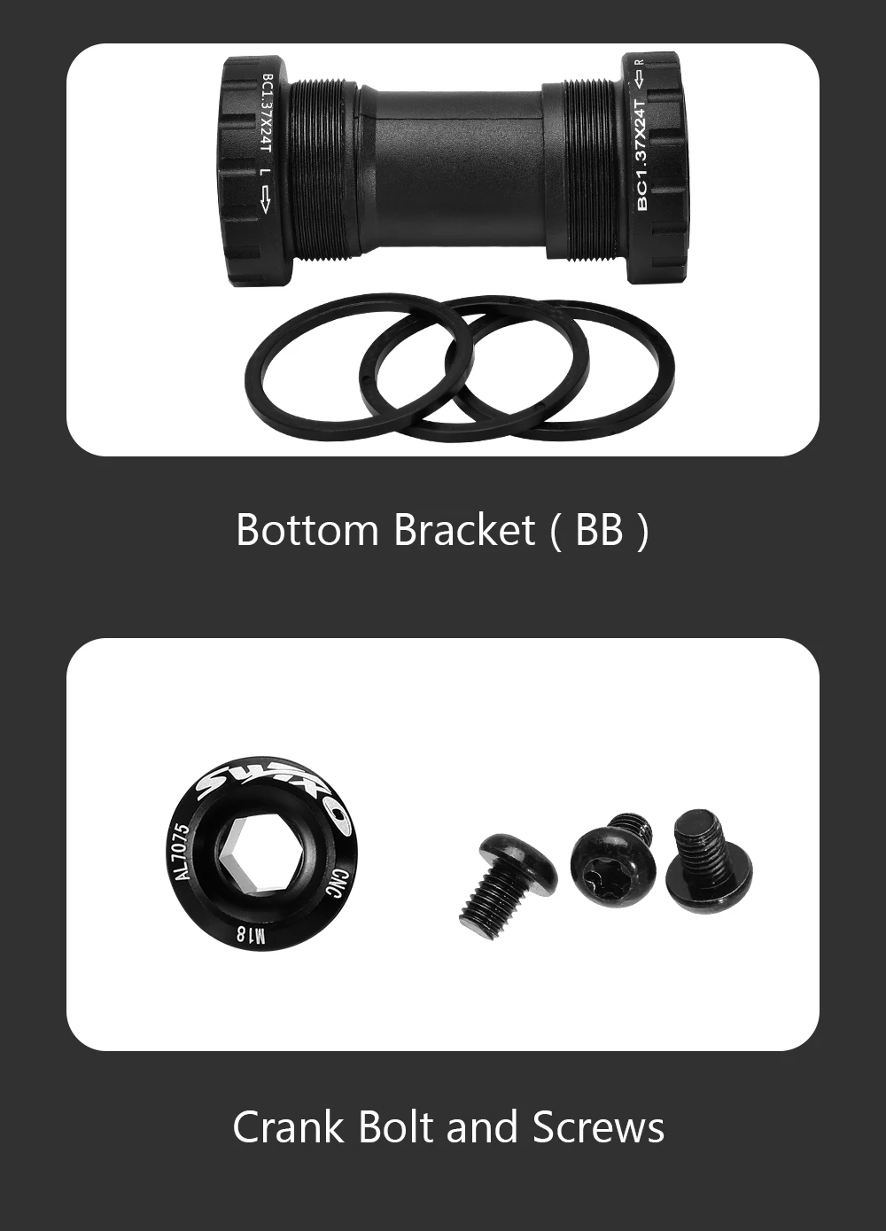 Спецификация резьбы: BC1.37 * 24T, наружный диаметр резьбы 34 мм, подходит для 24 мм-24 мм, 22 мм (с адаптером) -24 мм коленчатого вала