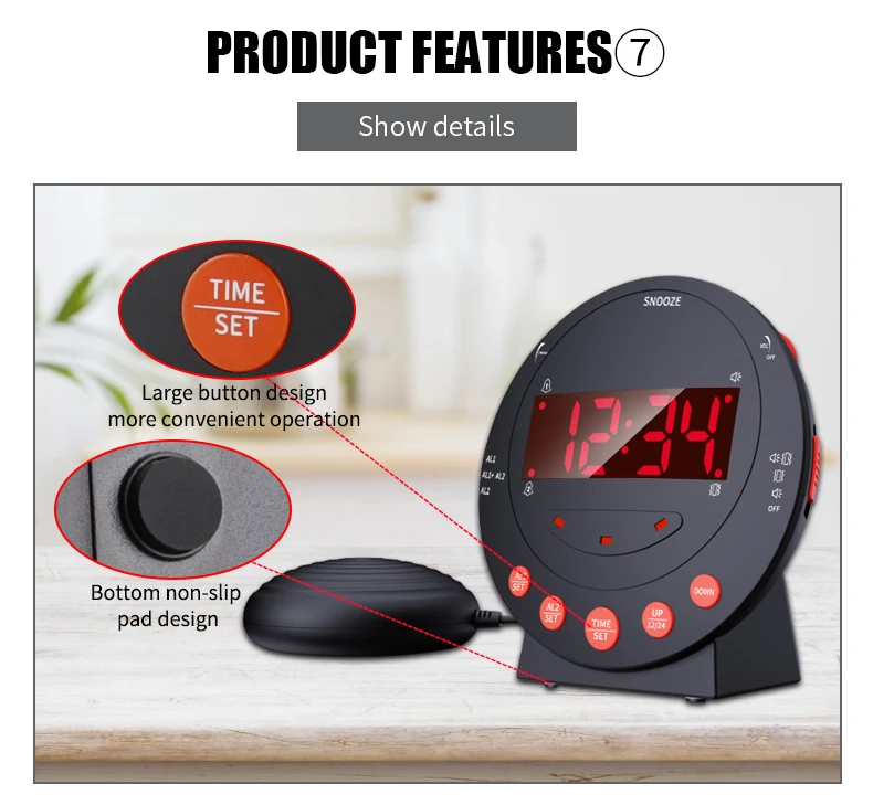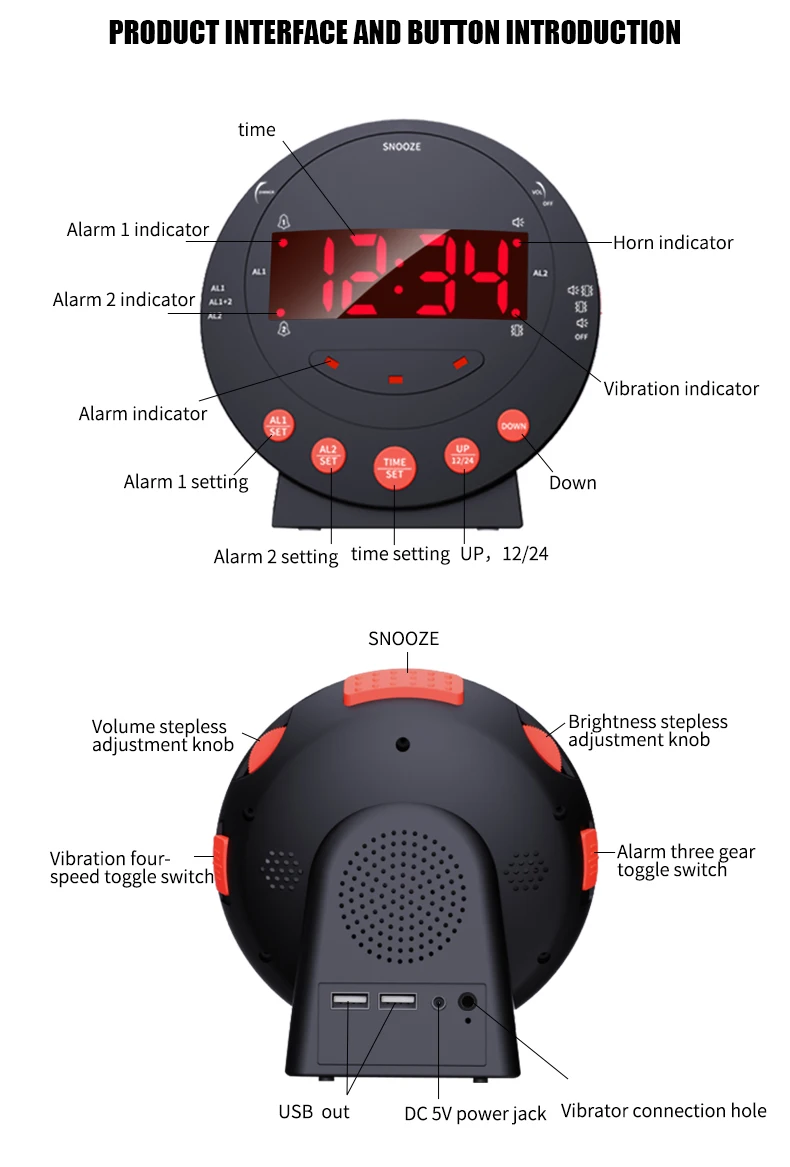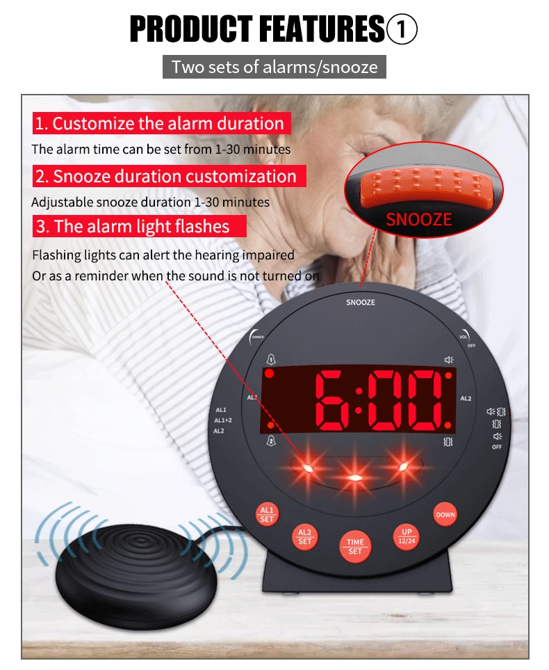 Светодиодный Вибрационный Громкий будильник сильный Вибрационный шейкер для тяжелых шпалов для глухих детей старшего возраста дисплей диммер Повтор USB зарядное устройство